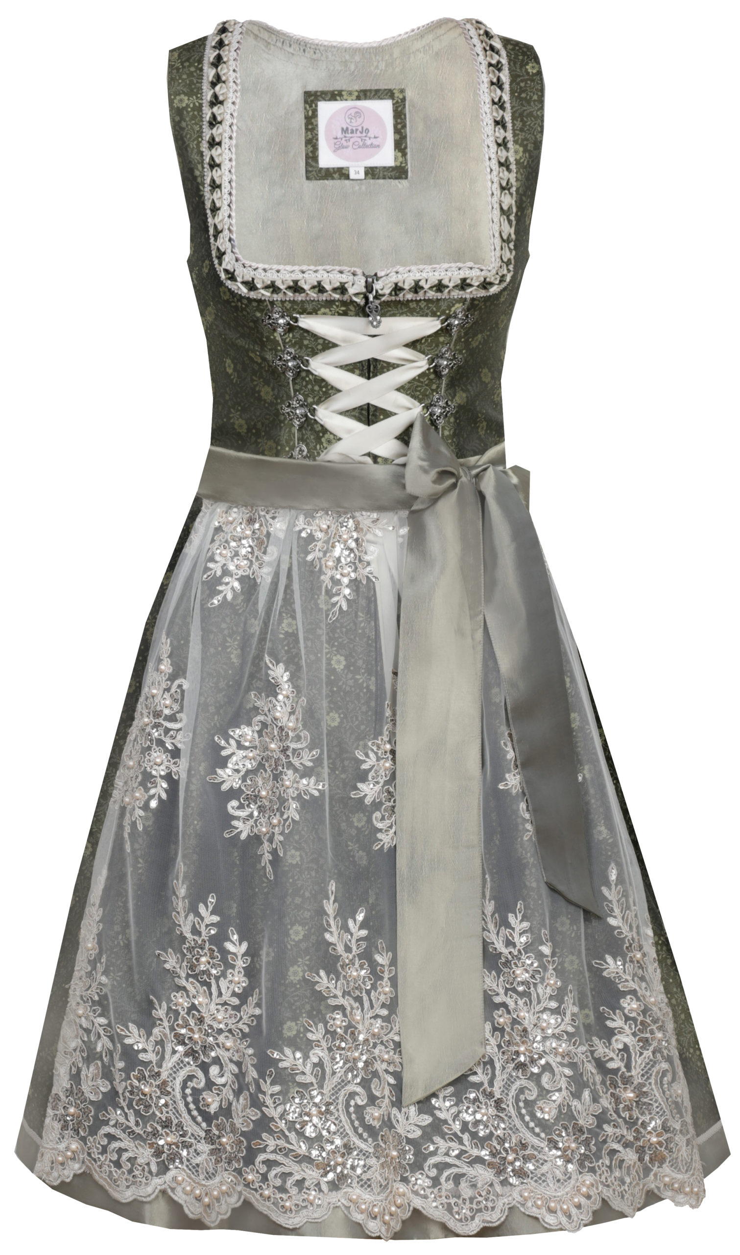 Lovely formal dress in a pretty brocade of subtle allover pale sage green floral on a deep olive green background.ย Bodice is trimmed with flat braid and traditional butterfly pleated ribbon.ย The large antique silver tone hooks make a statement with their marquis-shaped faceted rhinestone accents.ย The unlined ivory lace apron has a pretty contoured hemline, and the floral motifs are embellished with natural pearls and sequins.