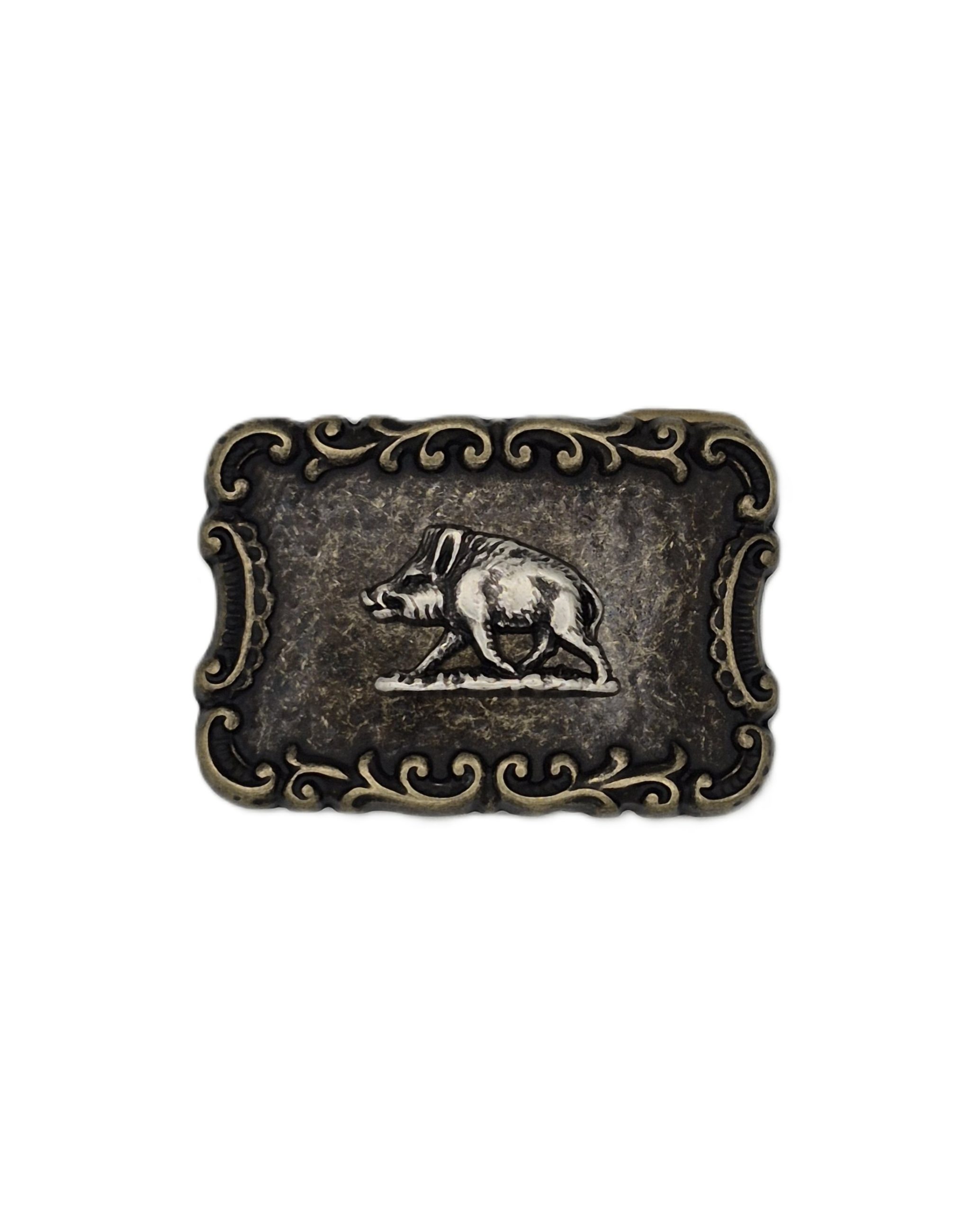 Slightly smaller scale rectangular buckle with decorative scrolled edges in antiqued bronze finish with a full side-view wild boar centre motif.