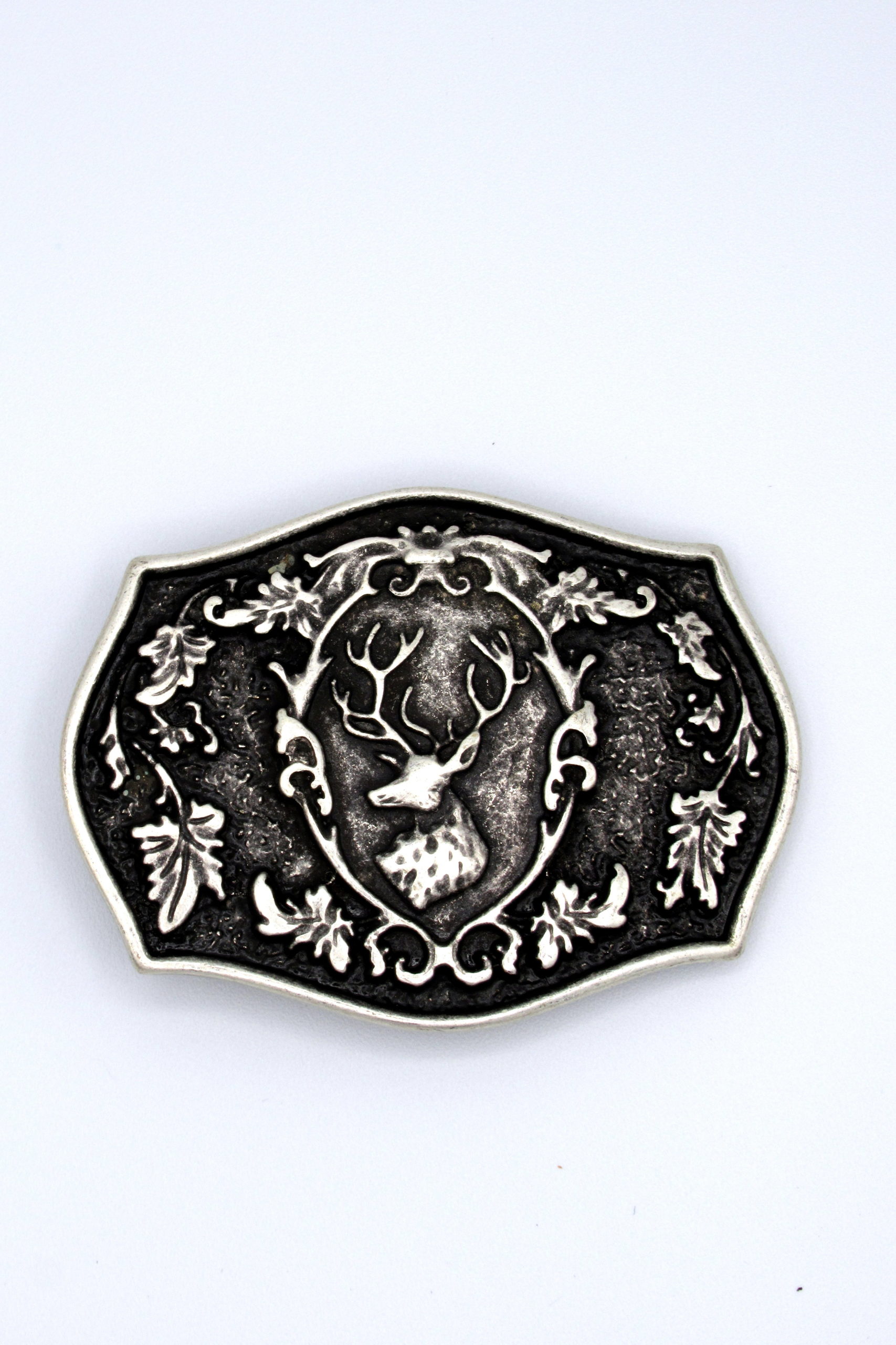 Another buckle with a traditional stag theme; this one is more refined, with the stylized stag head encircled with acanthus leaves and scroll details.ย Antiqued silver finish cast metal, made in Germany.