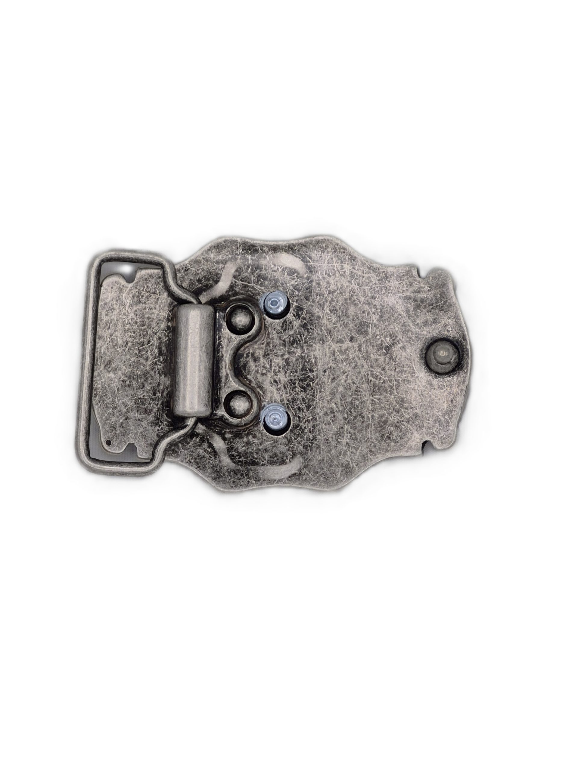 Unique buckle with a decorative scrolled edge features a stylized elongated eagle motif at the centre.ย The buckle is antique silver finish; central motif is bronze finish.ย Suitable for a 1.5 inch width belt that accepts interchangeable buckles, such as those we have listed separately.