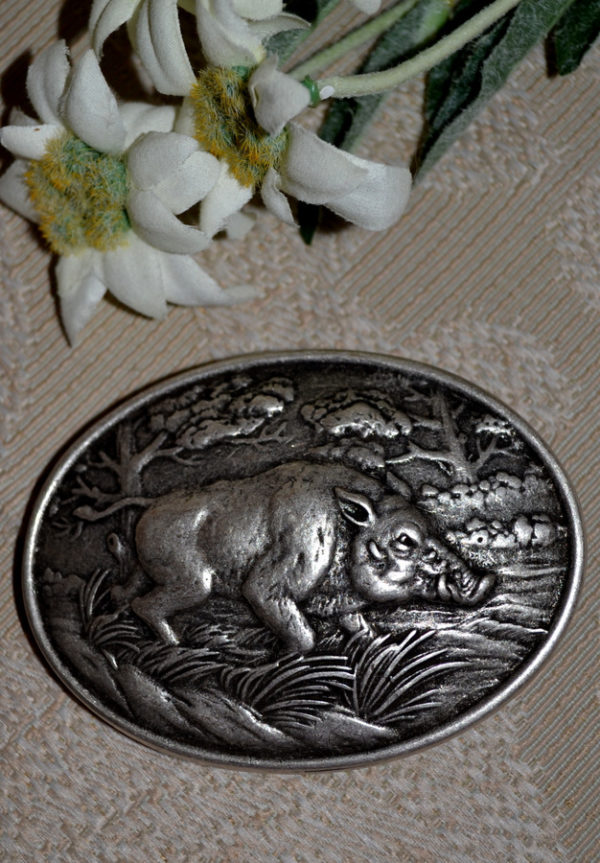Oval belt buckle in antique pewter finish features popular hunting theme of a wildschwein or wild boar. Great detail in the figure as well as the background.