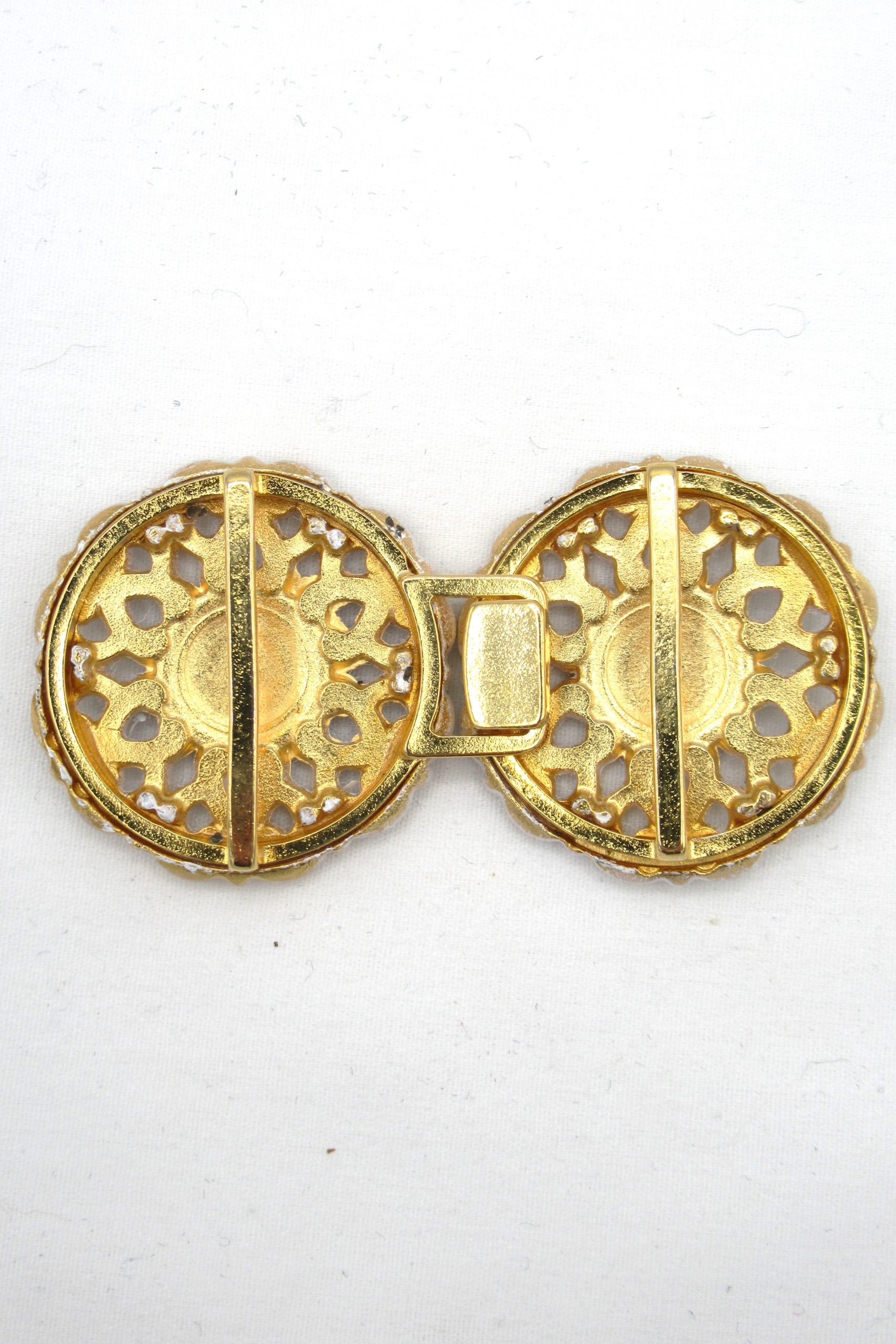 Delicate openwork gold finish metal crisply cast in Austria.ย Each circular section measures about 1 3/8 inches in diameter; giving an overall width when fastened of 2 3/4 inches.