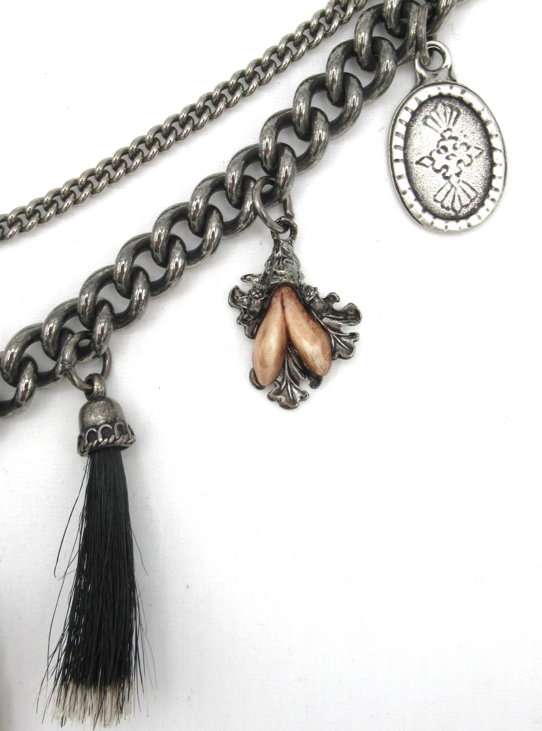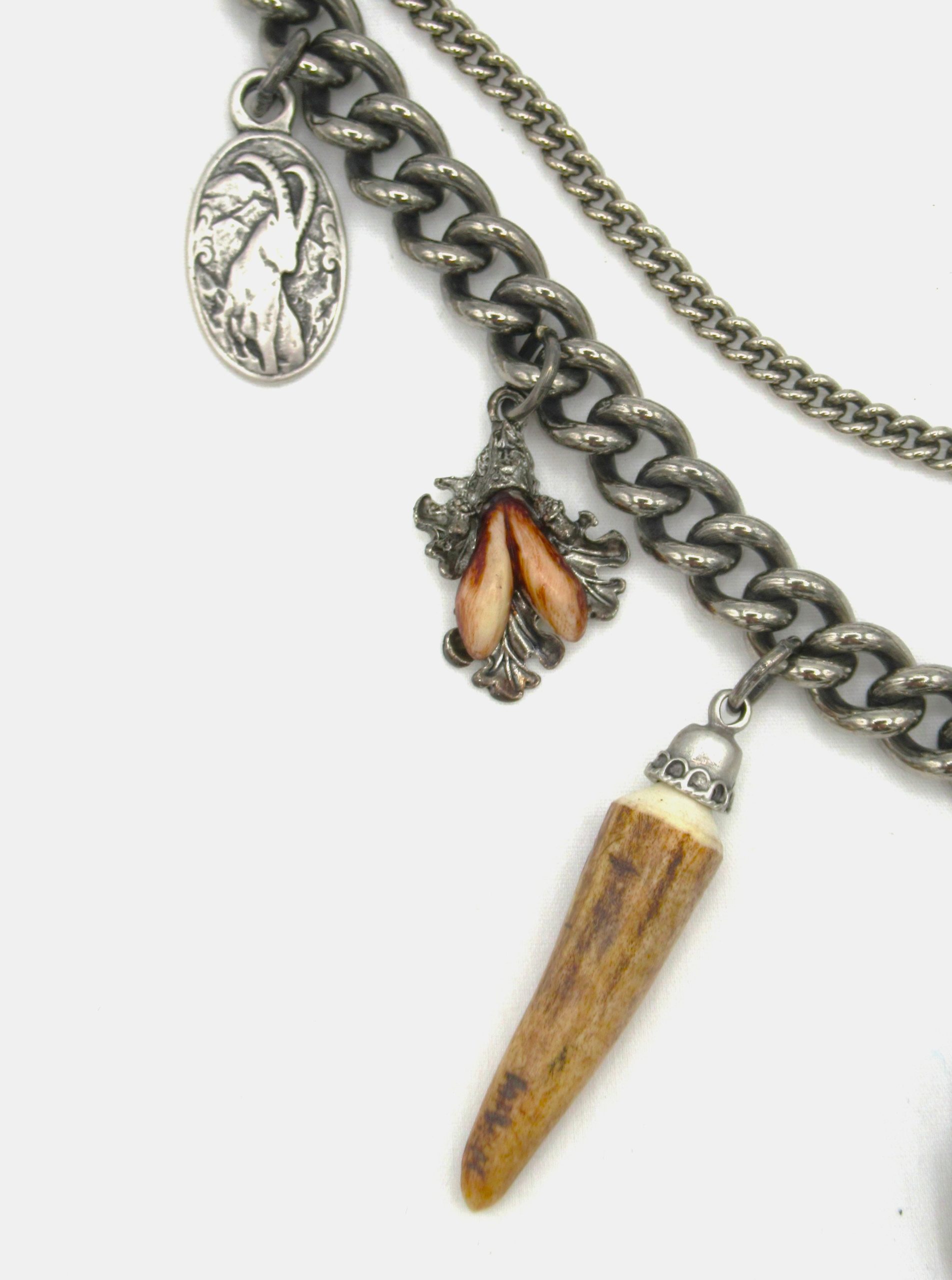 Another amazing hand-made charivari from Trachtenschmuck Stephan, that combines metal charms, genuine wild boar’s teeth, an antler tip and a mini-gamsbart with a fabulous heavy antler rosette with metal coin motif at it’s center.ย Charms are suspended from a heavy steel curb chain, with a shorter, finer gauge chain above.