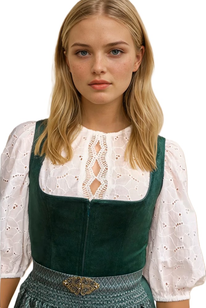 Understated monochrome dress with soft bodice, that gives the look and feel of velvet.ย The skirt is brocade with a very subtle vertical stripe texture and a slight sheen.ย The apron is brocade with dark green geometric motif against a sage green ground, and features half-elasticized waistband that fastens at the front with a decorative metal clip.