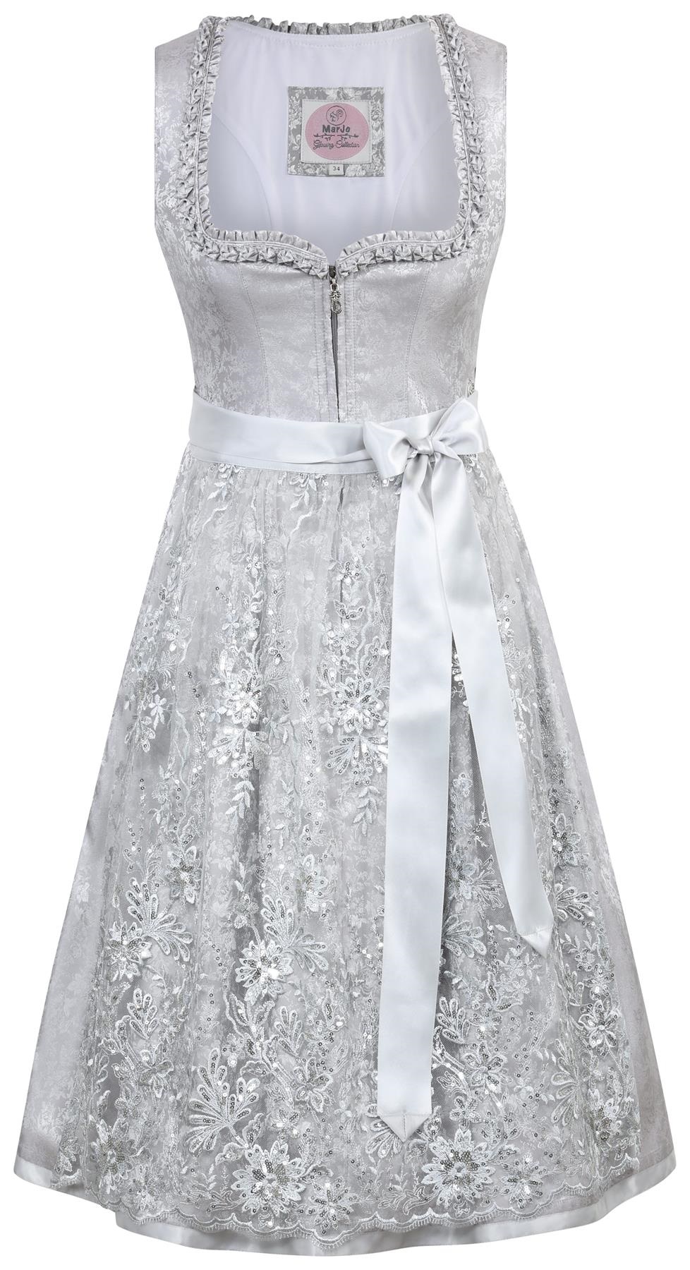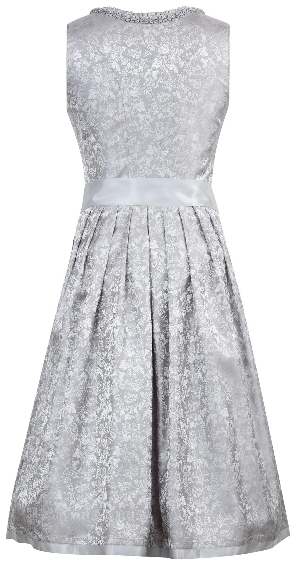 Elegant tonal floral brocade dress in a soft shade of grey and silver features embroidered lace apron with silver sequin accents and sculptured hemline.ย Traditional pleated fabric trim around the neckline and satin banding at the hemline of the dress.ย Two side pockets with invisible zipper closure help keep your valuables secure.