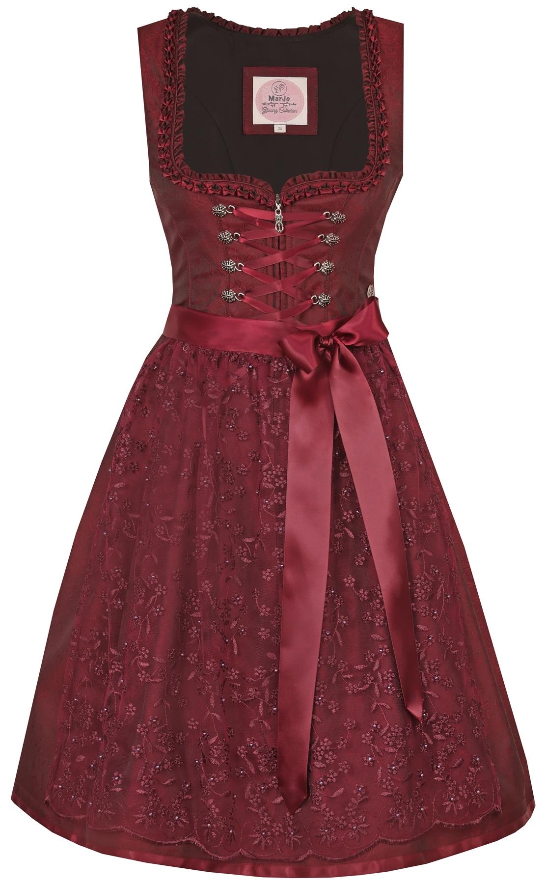 Beautiful brocade dress with traditional pleated fabric trim around the sweetheart neckline; front zip bodice includes antique silver tone hooks and a satin lacing ribbon.ย The unlined burgundy lace apron is decorated with scattered small pearls that blend nicely with the colour of the apron, and give added interest and a touch of elegance.ย ย In each side seam of the skirt you will find a concealed zippered pocket, to securely keep all your small necessities close to hand.