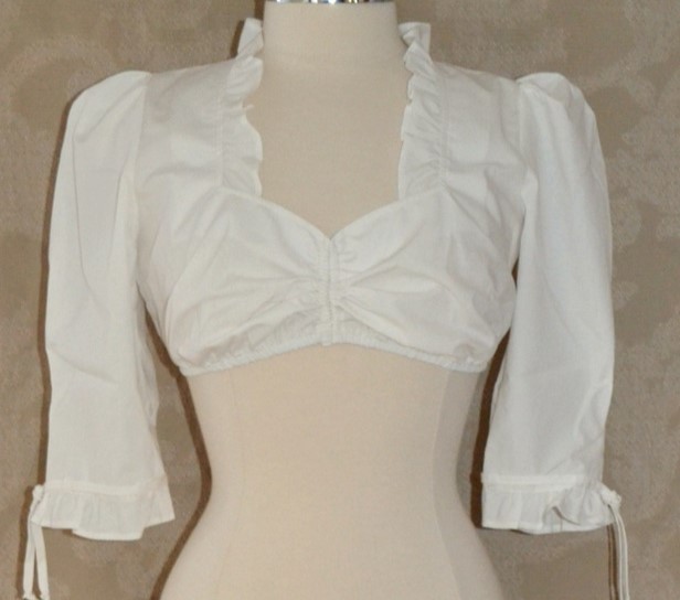 Lovely soft ivory/off white blouse in a classic understated style features drawstring to adjust the sweetheart neckline, which is accented by a fabric ruffled. Sleeves are slightly gathered, reach just to the elbow and have fabric loops and ties above the ruffled hem.