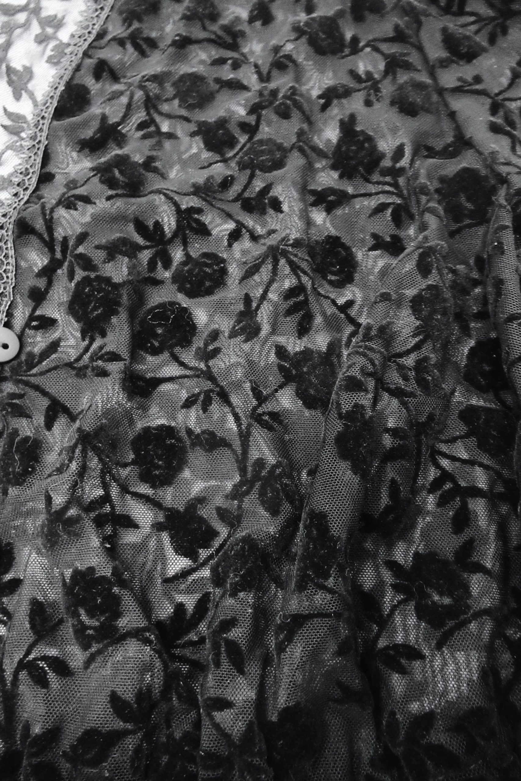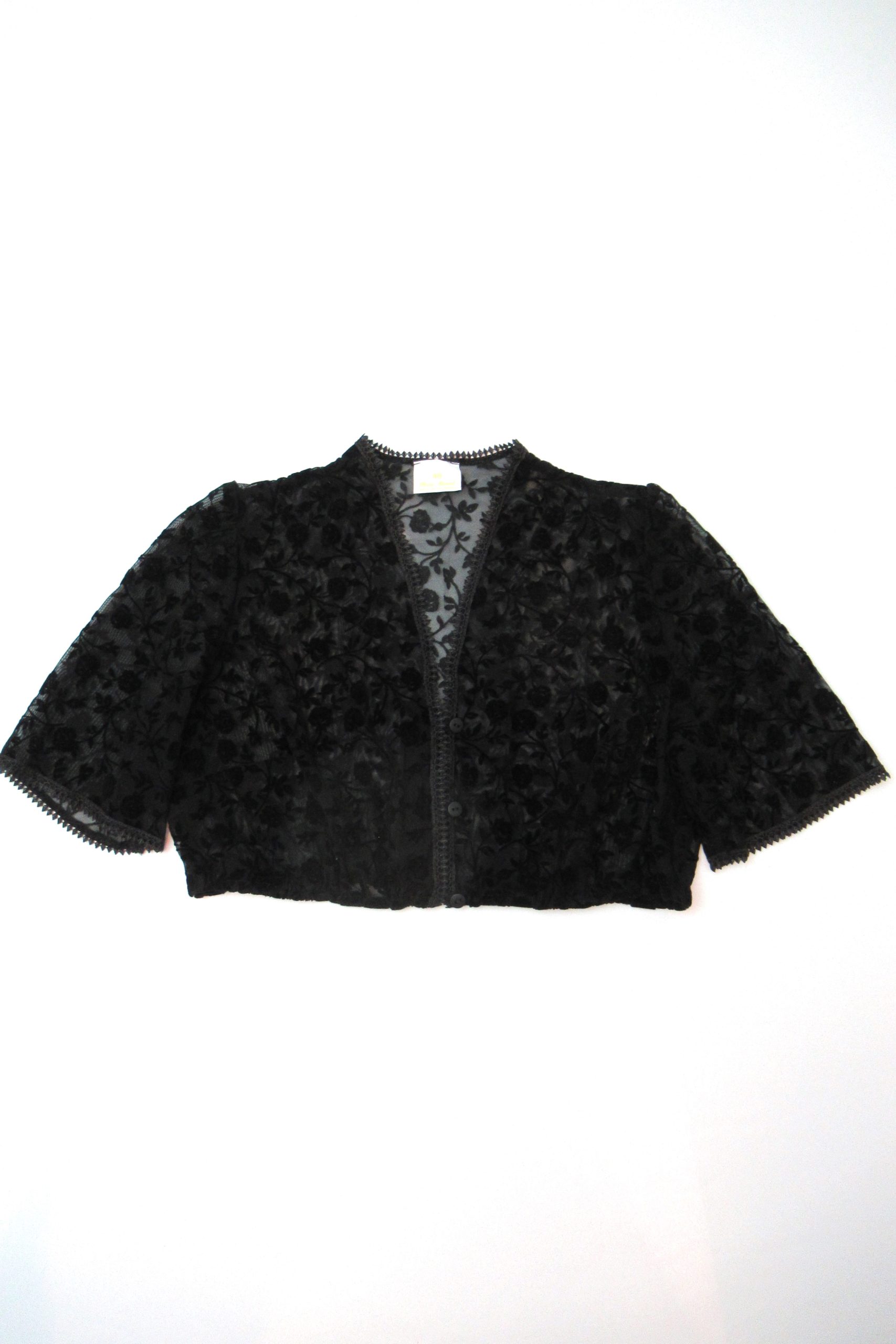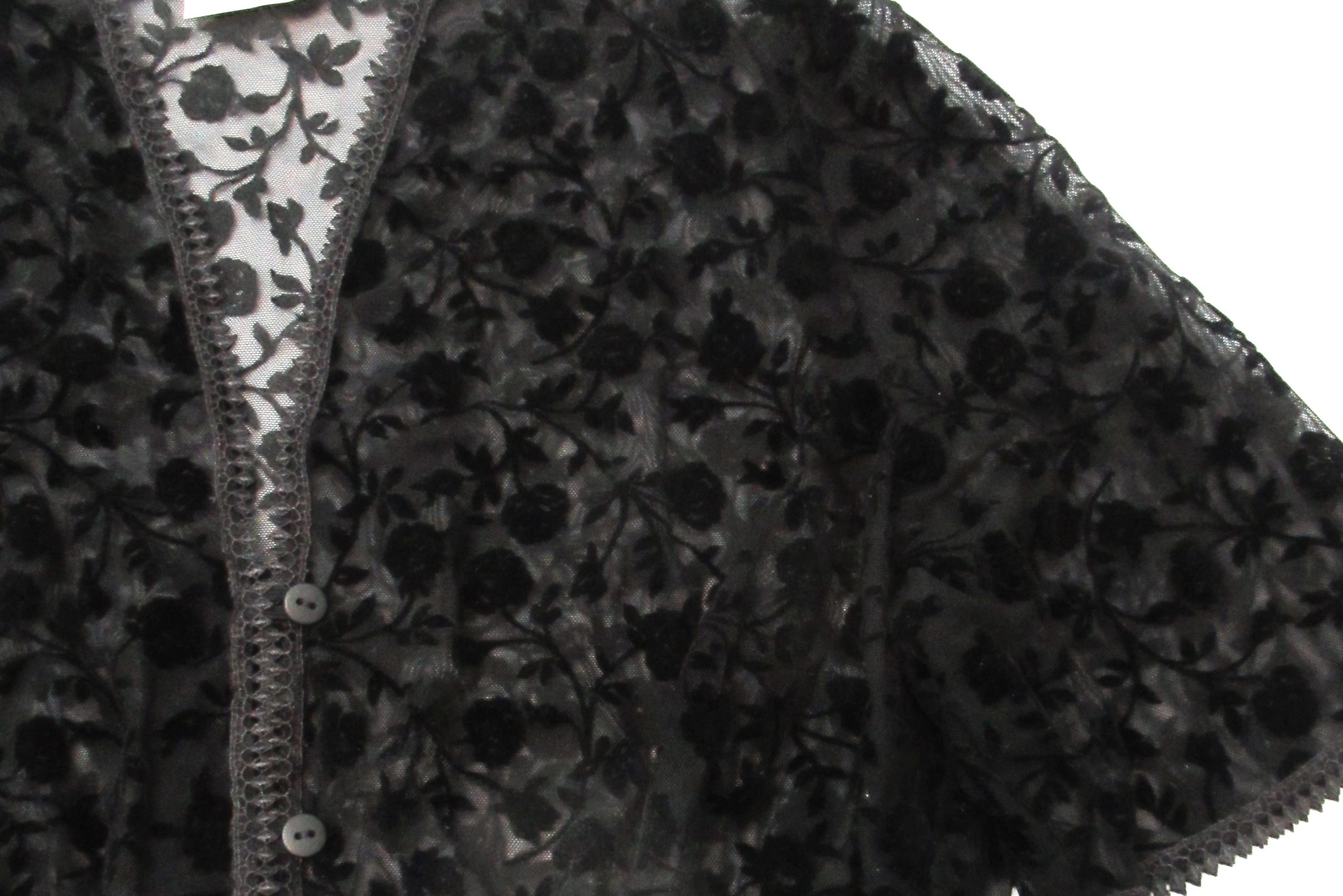 Photos don’t do justice to this stunning blouse in allover roses pattern in velvet flock on fine mesh, which shows beautifully against the skin!ย ย V-neckline and hems of the straight sleeves trimmed in lovely black bobbin lace; neckline trim extends down the front of the blouse, which closes with 3 black buttons.ย ย Hem of the blouse is elasticized to stay firmly in place.
