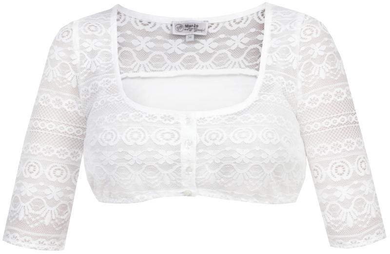 Lovely lace button-front dirndl blouse with 3/4 length sleeve.ย The lower portion of the back is fine stretch jersey, which makes it very comfortable to wear.