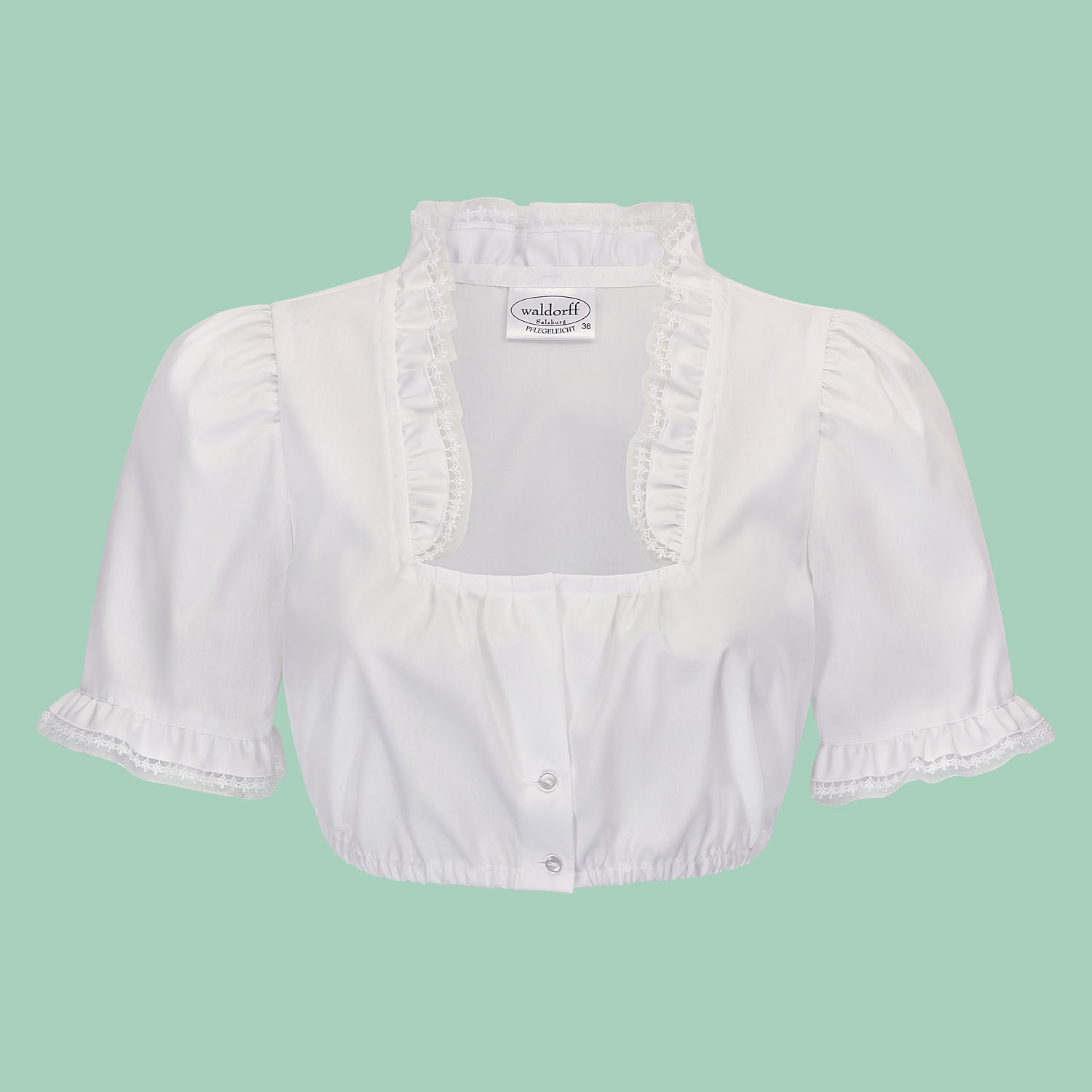 Beautiful, high-quality cotton dirndl blouse from Waldorff – one of the most respected makes of traditional clothing.ย Traditional gathered sleeve and ruffled neckline are trimmed with pretty lace and organza.ย ย A timeless classic, you’ll enjoy for years to come.