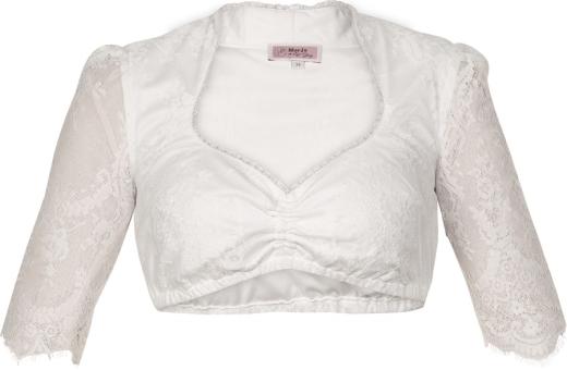 Pretty lace blouse with elbow-length lace sleeves, in a lovely creamy-white shade. The body of the blouse is fully lined with comfy lightweight stretch fabric front and back; sleeves are sheer lace with scalloped hem.