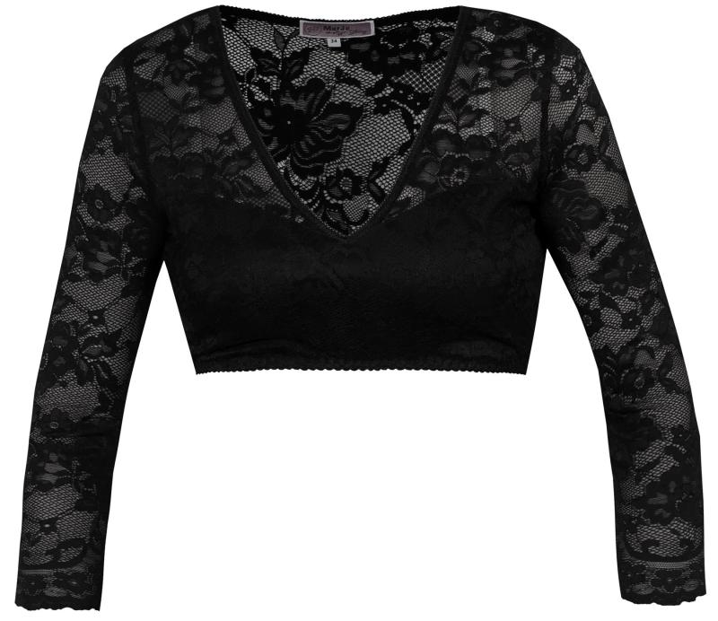 Lovely V-neck lace blouse with slightly longer, below the elbow sleeve.ย The front of the blouse is partially lined in matching jersey knit to provide coverage for bra cups and an extra measure of modesty.ย Available in off-white or black.