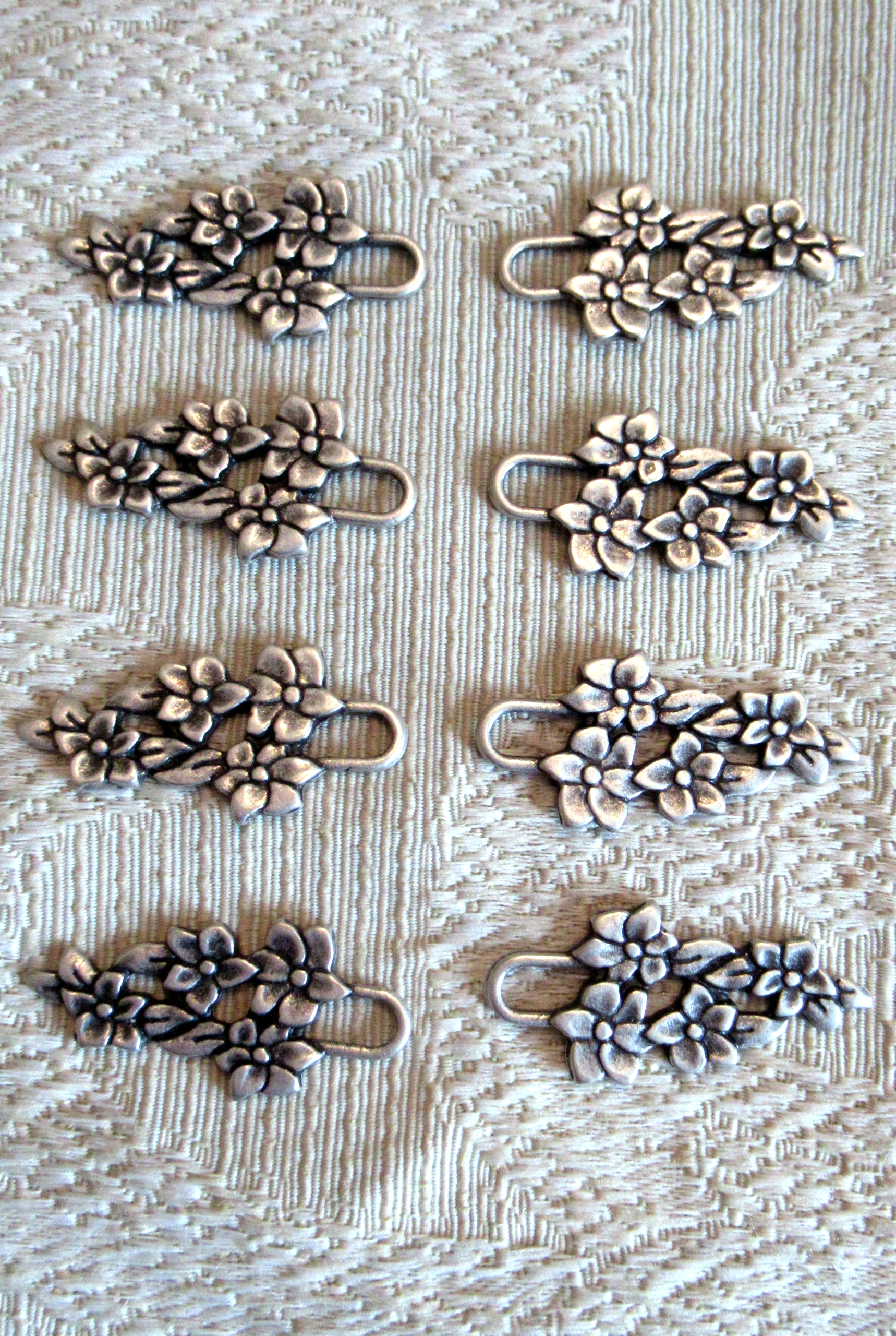 Pretty floral loop hooks are cast in lovely detail in antiqued pewter finish. Each hook measures 1.5 inches/ 38 mm wide (including loop) by .75 inches high/18mm high at the tallest point