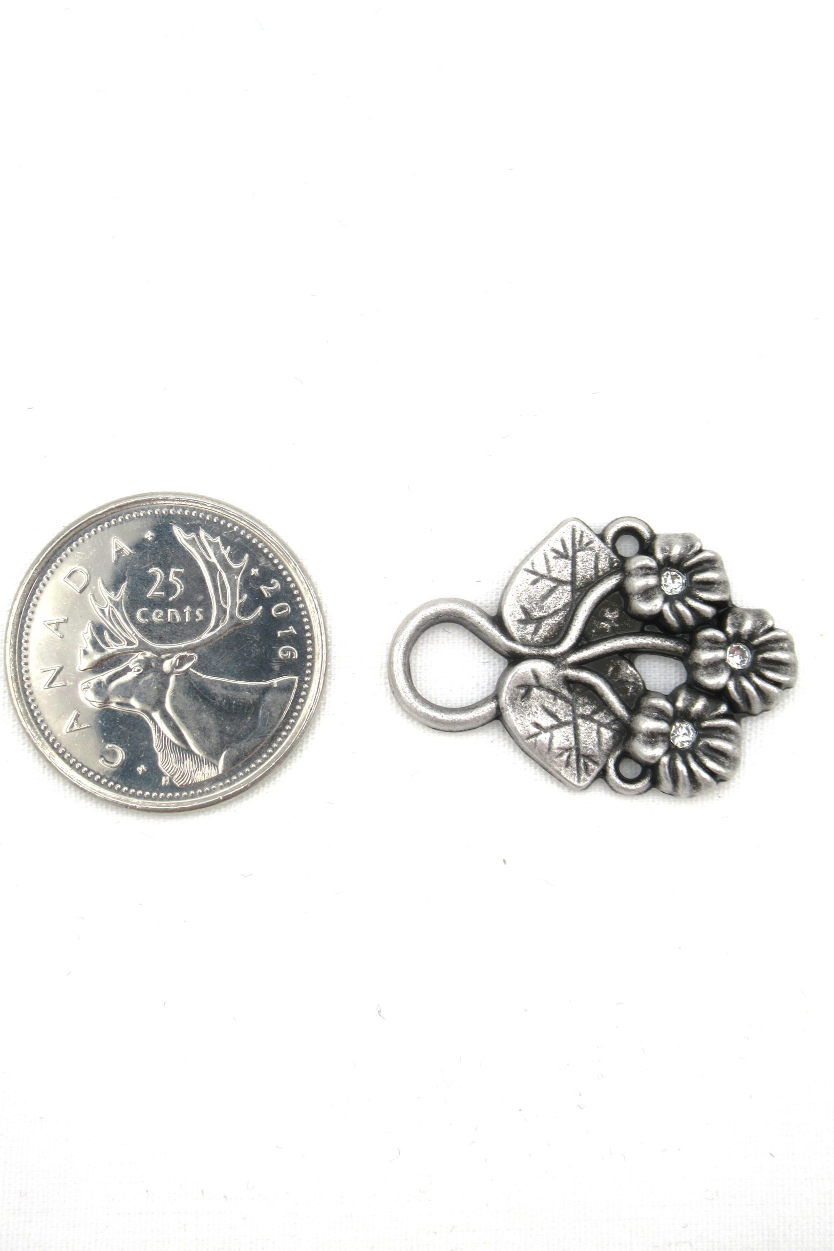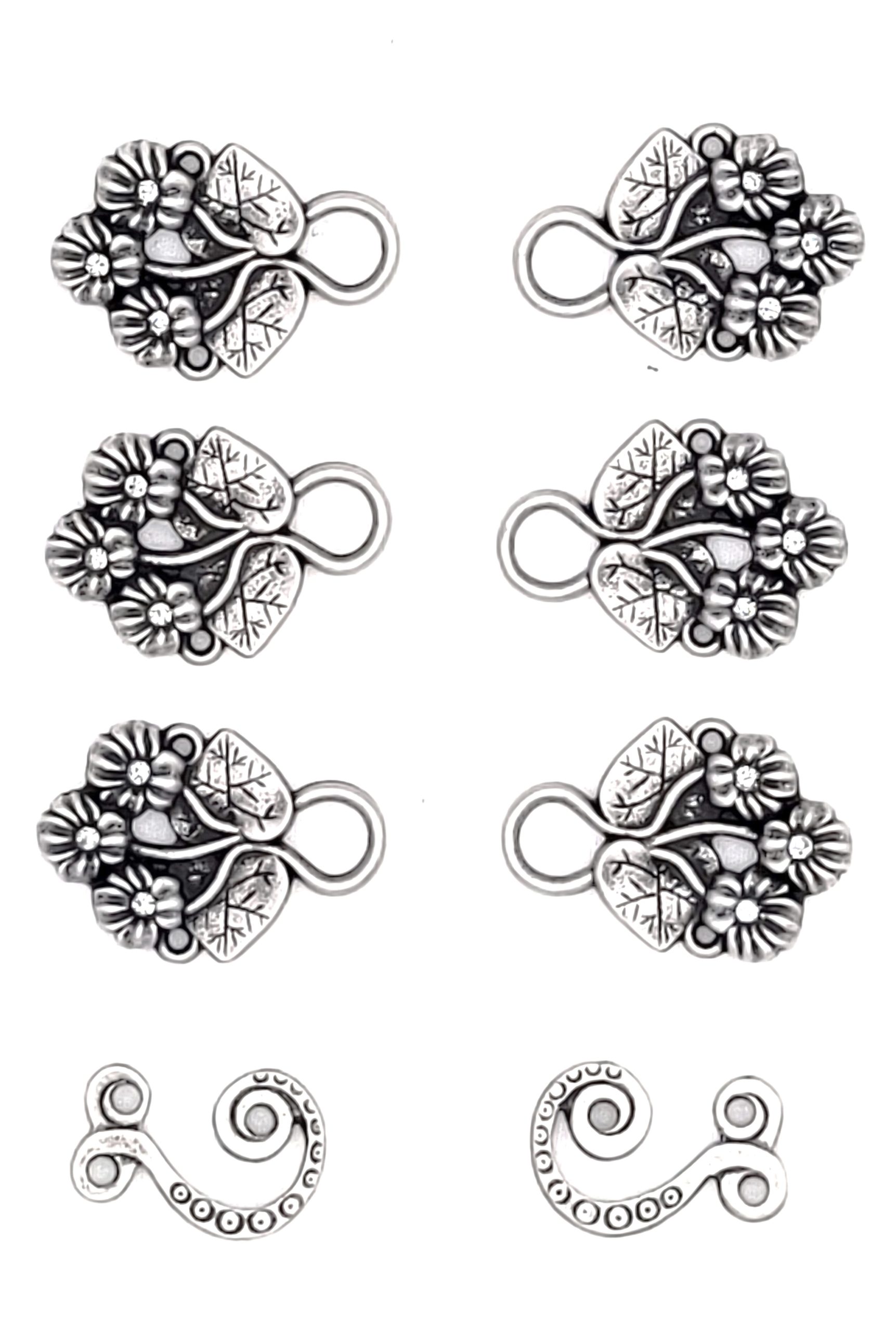 Pretty floral-motif hooks in a soft pewter finish with some antiquing to show details.ย Each of the three blooms has a tiny swarovski rhinestone at its centre.ย Closed loop design to securely hold the lacing ribbon in place.