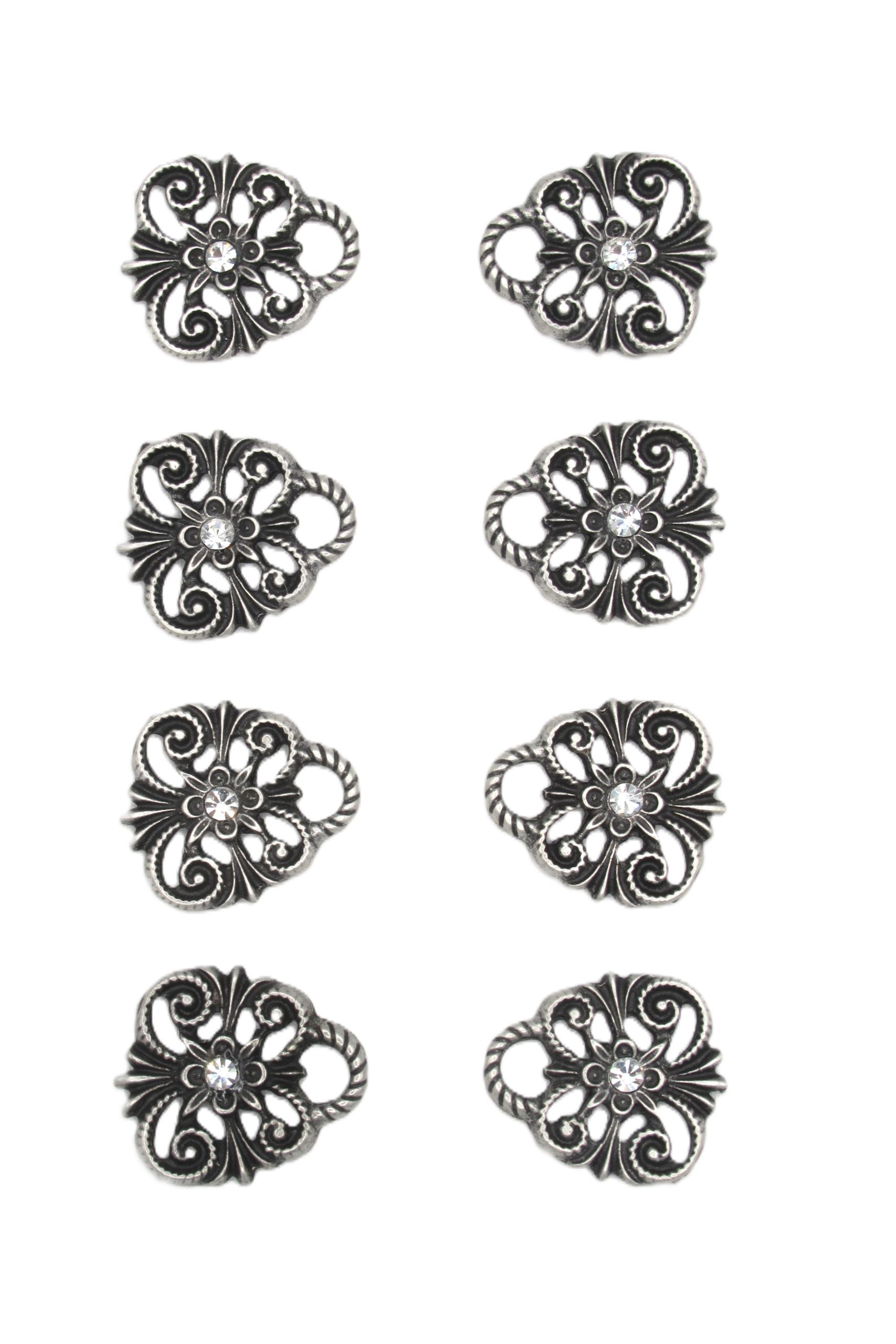 Lovely, crisply cast antique pewter hooks with sparkling clear crystal center accent.ย Closed loop to hold ribbon securely.ย Measures 1 inch/25mm in diameter.