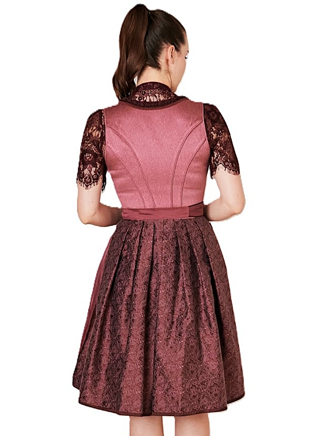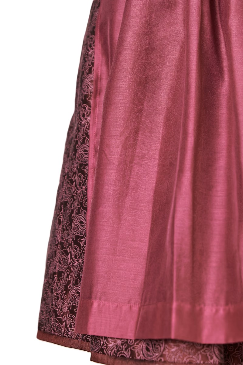 Lovely dress in a great colour/print and fabric combination paired with contrasting wide butterfly pleated trim on the bodice.ย The bodice is softest brushed cotton twill in a mid raspberry shade trimmed with luxurious folded fabric and flat braid around the neckline and on either side of the zipper.ย ย The skirt portion is burgundy brocade with allover fine swirls/paisley pattern in the same shade as the bodice.ย The apron is burgundy semi-sheer voile with satin ties in burgundy lined with raspberry.