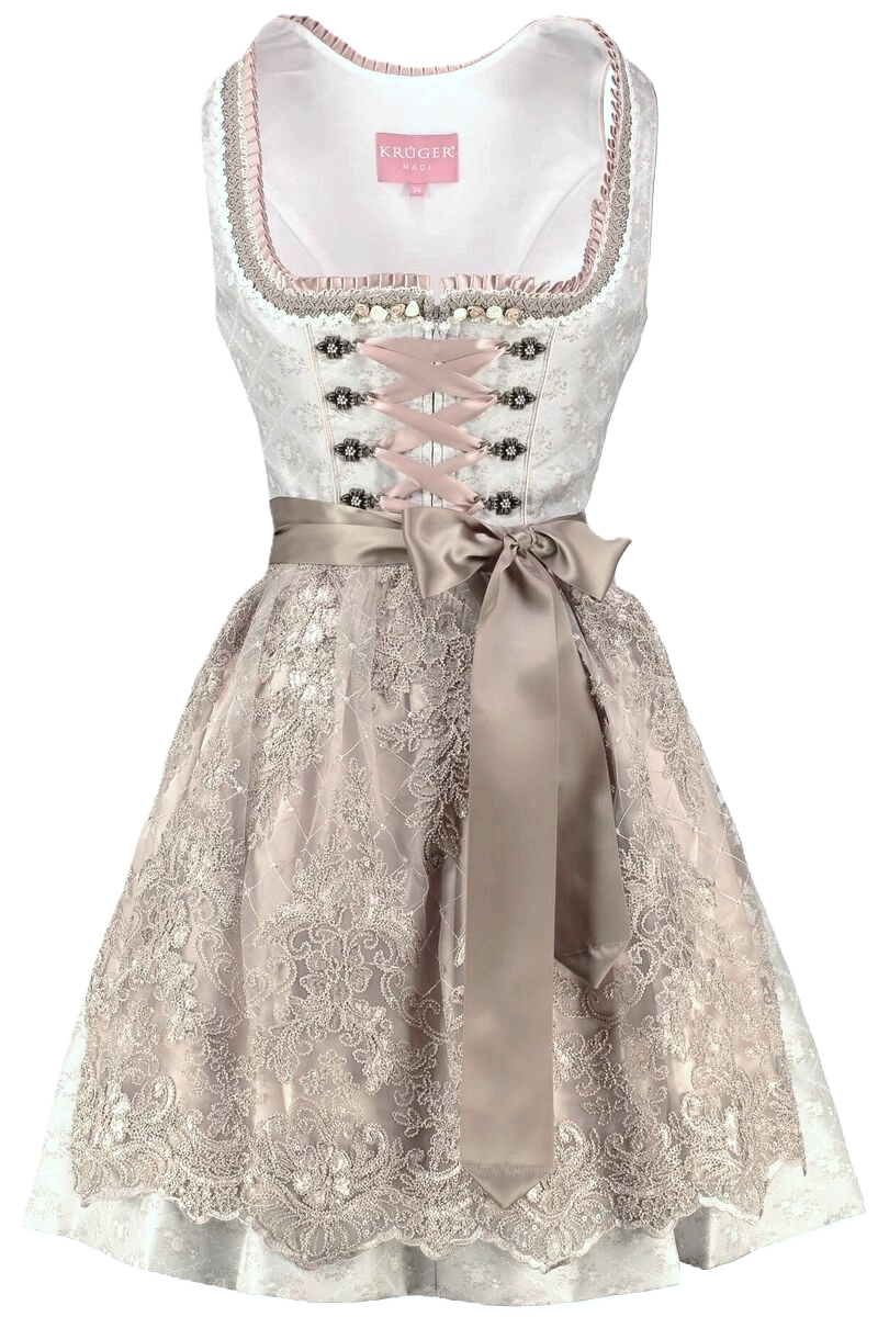 Elegant and understated dress in a soft shade of creamy beige and taupe floral print brocade features a lined taupe lace apron scattered with clear sequins.ย Bodice trimmed with taupe satin ruffle, flate braid and lace, with taupe and cream ribbon rosebuds. Bronze finish hooks are embellished with tiny pearls.