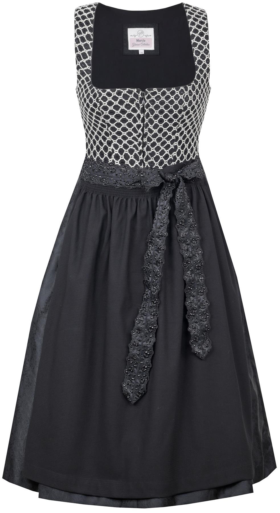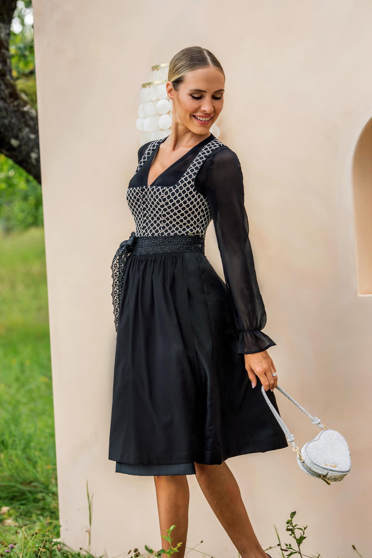 Unique black and natural embroidered lace fabric used for the bodice provides texture and visual interest to this classic black dirndl.ย The skirt portion is a lightweight poly brocade, while the apron is soft, lightly crinkled crepe.ย The apron ties are bejeweled wide mesh ribbon, to add a little glitz.