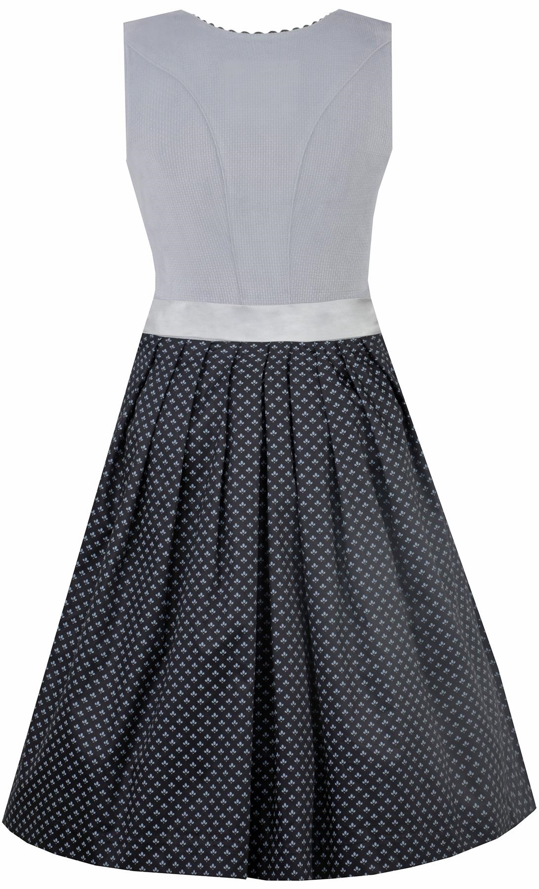 Neutral black and silver colour combo never goes out of style.ย The bodice is textured velvet in a soft silver-grey; the skirt portion is 100% cotton in black with scattered medium grey-blue print and the apron is silver taffeta with black trim at the hemline.ย The apron strings have interior elastic and fasten at the front with a decorative antique-silver tone clip.
