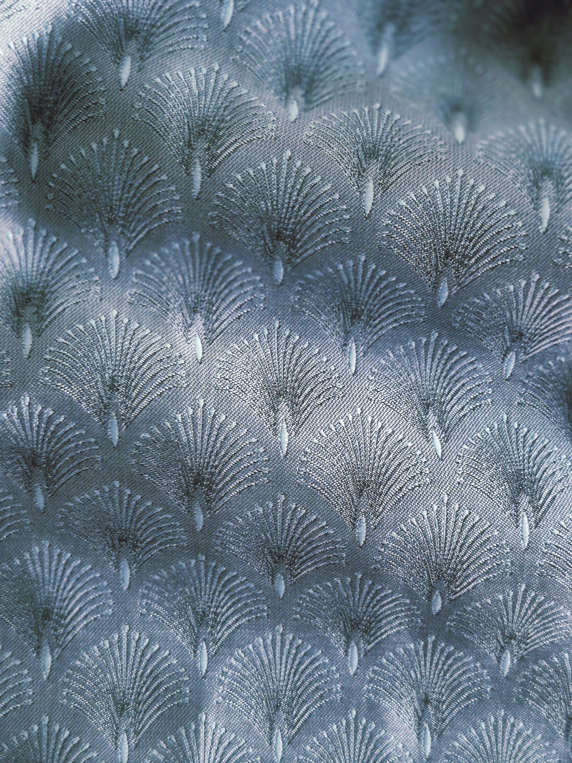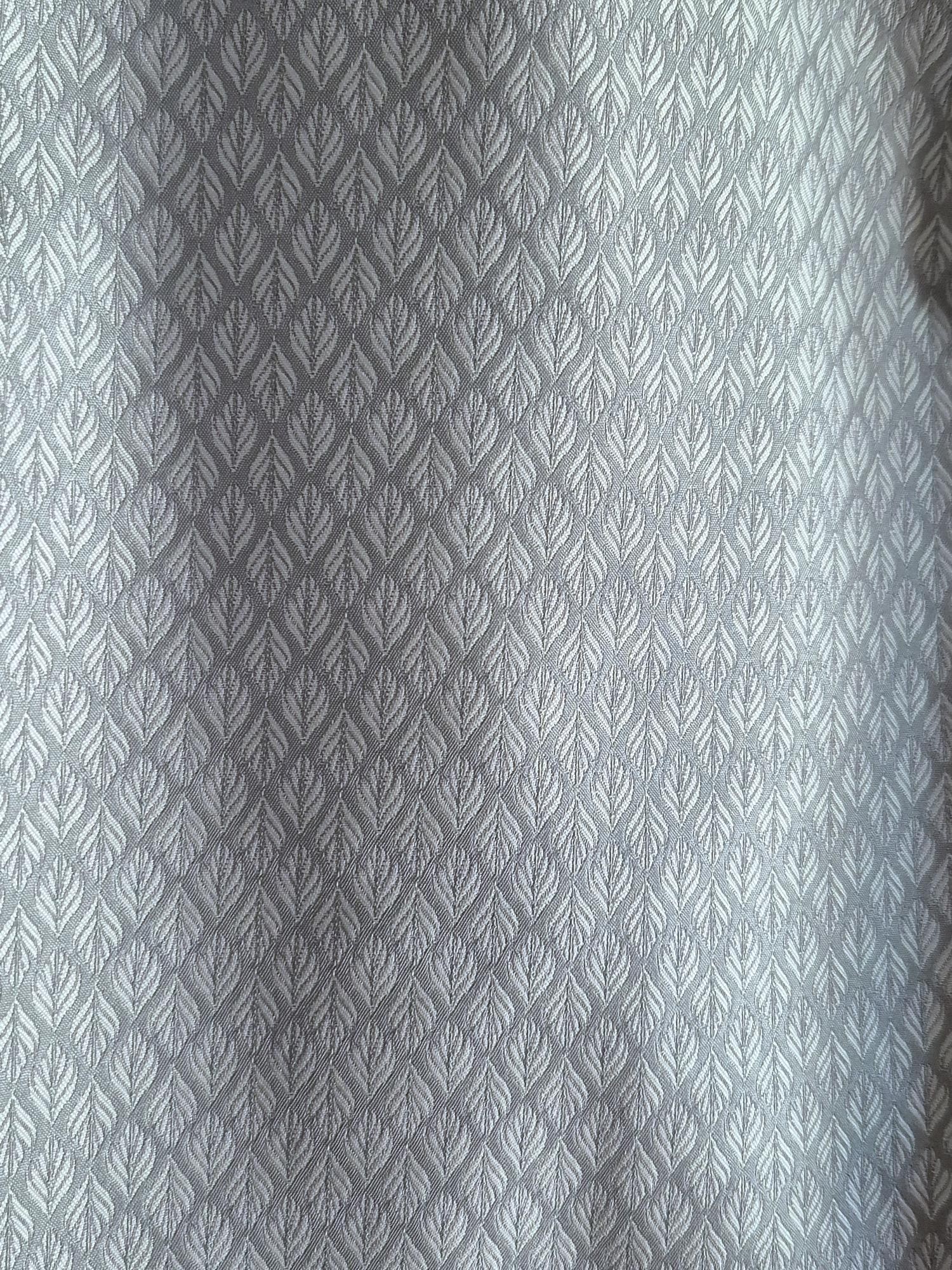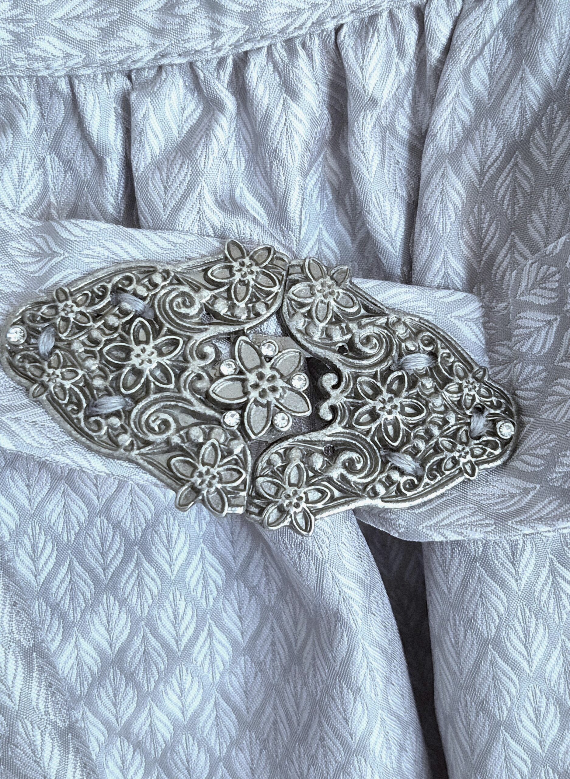 Beautiful dress with a deep navy velvet zip-front bodice paired with a slate blue and silver grey skirt in an elegant frond pattern.ย The silver brocade apron is an allover small leaf motif and features an elasticized waistband that fastens at the front with an filigree clip adorned with small rhinestones.