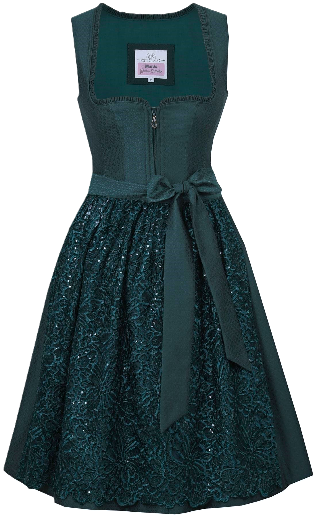 Elegant dress in a deep jade green brocade fabric.ย Zip-front bodice with flattering modified sweetheart neckline edged with a narrow ruffle and a crystal drop zipper charm.ย ย The matching embroidered lace apron has a scattering of sequins for added sparkle.