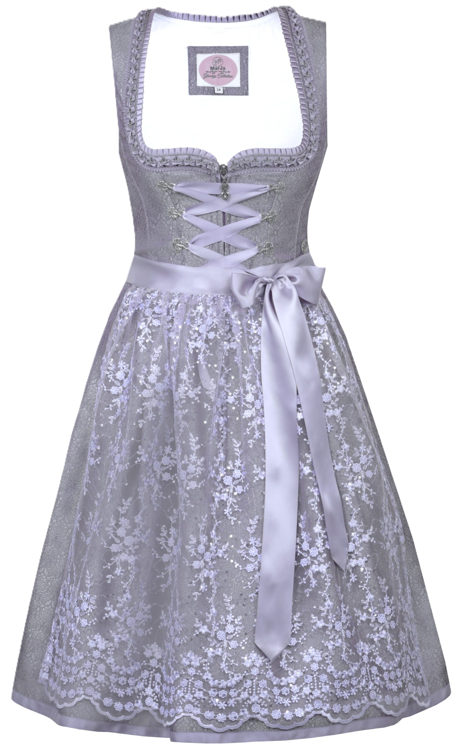 Very pretty dress in a muted lavender brocade features traditional hooks and lacing ribbon over a front zip closure.ย Neckline is trimmed with ruffle, pleated ribbon and flat braid to give a really elegant and finely detailed look to the dress.ย The floral pattern lace apron is a slightly livelier shade of lavender, and has a lovely contoured hem and sequins for interest and shimmer.