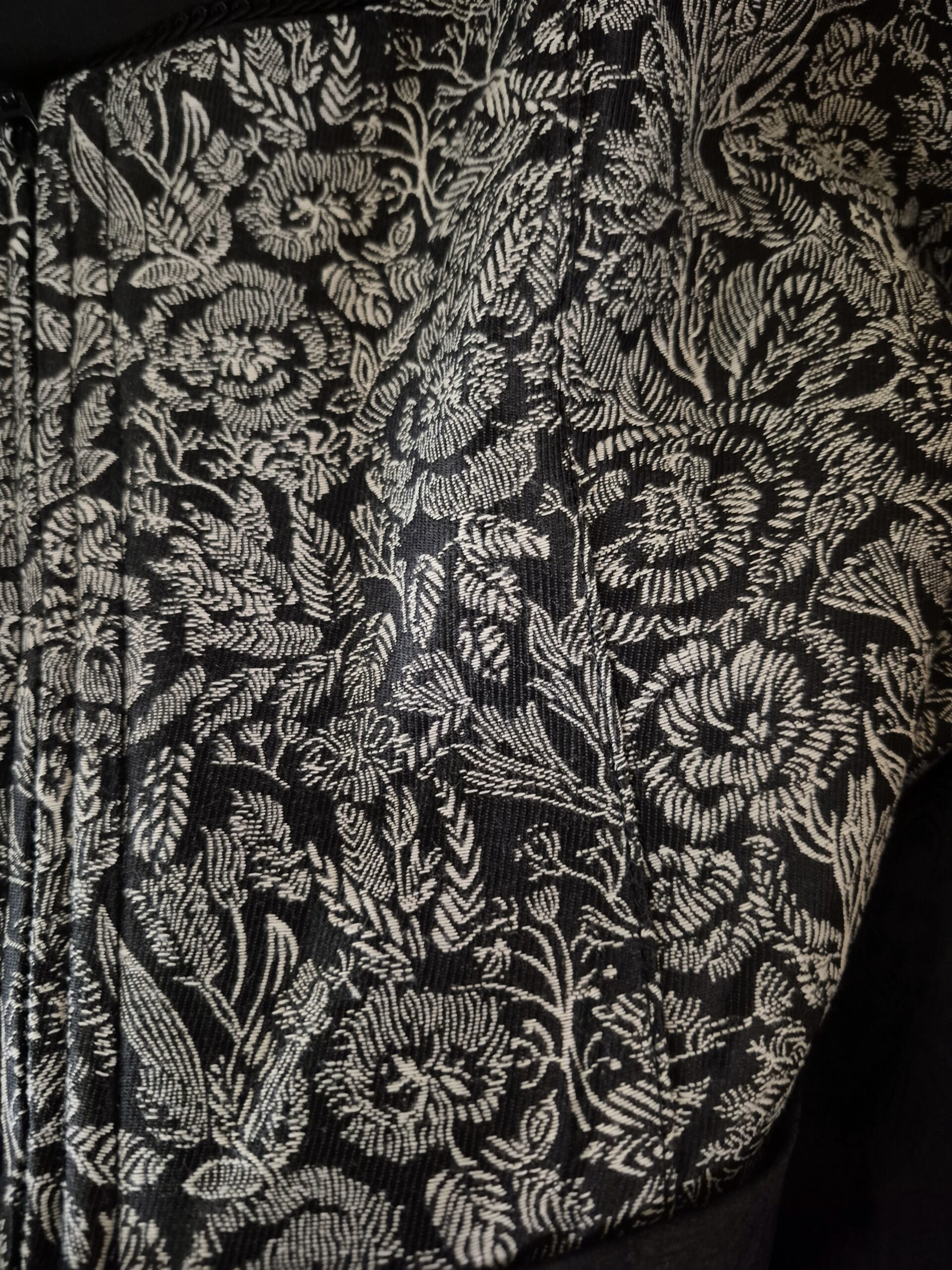 Dressy dirndl with unique zip-front brocade bodice in an botanical print in ivory on black.ย The solid black brocade skirt has a subtle floral pattern; the same fabric is used for the sash of the black sheer voile apron.