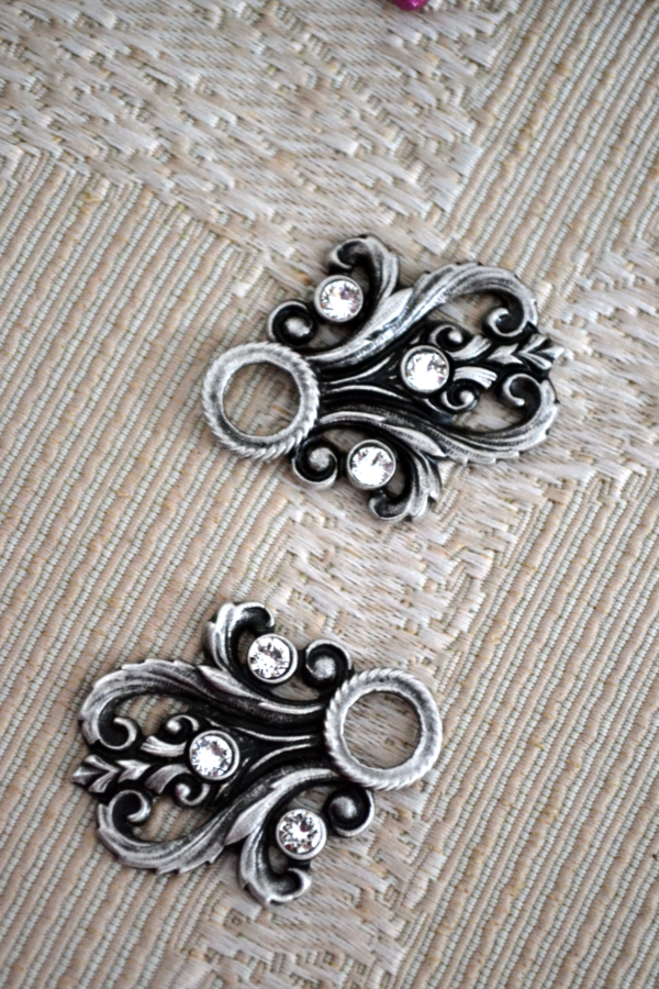 Lovely antiqued pewter bodice hooks in an intricate design accented by three sparkling clear rhinestones. Designed and beautifully cast in Austria, these are high quality hooks that will look great on your sewing projects. An economical way to refresh the look of your favourite dirndl, too!