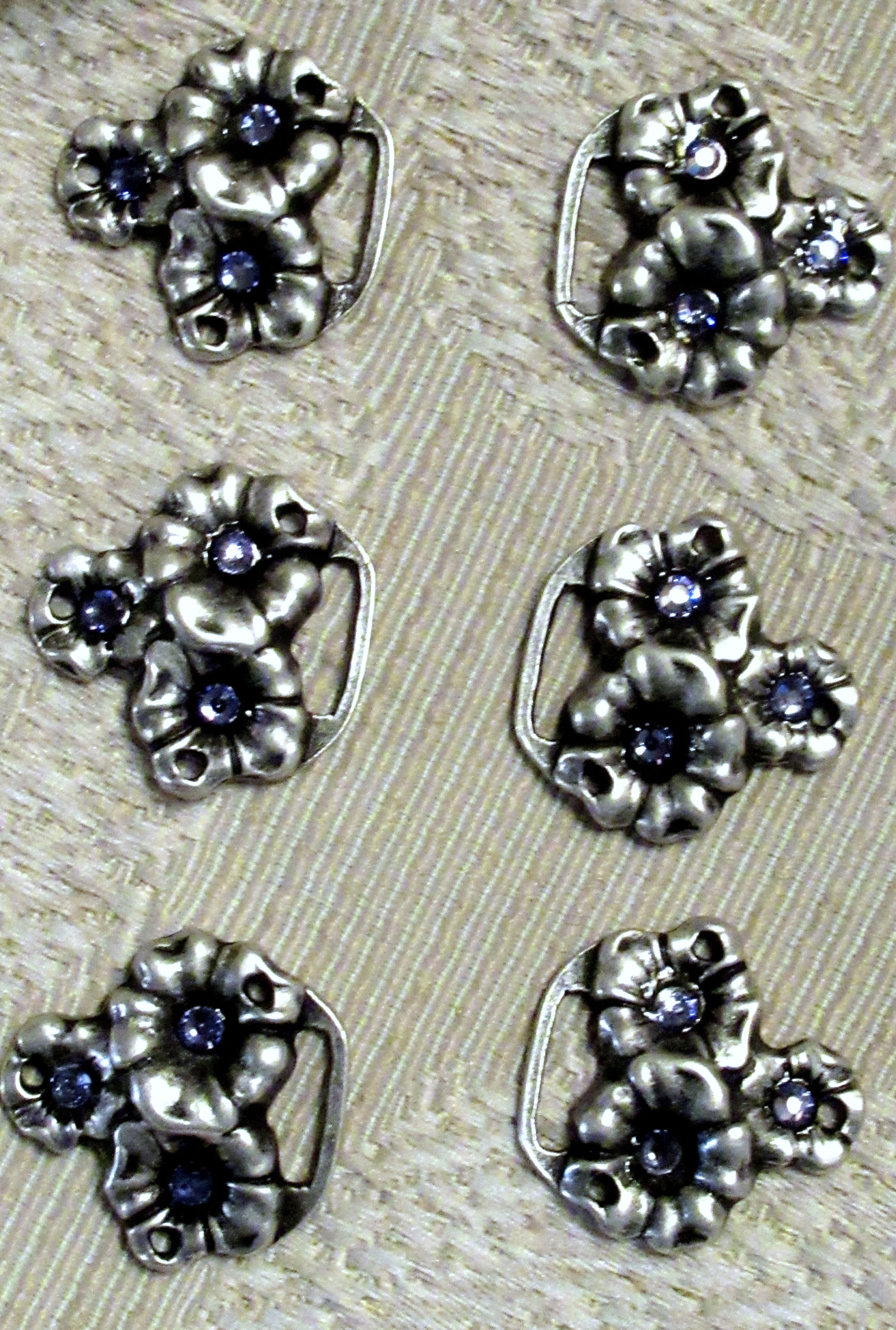 These hooks are a pretty addition to your sewing project, or a great way to refresh a dress already in your closet. Closed-loop design in antique pewter finish is nicely cast floral motif with single rhinestone at the centre. They measure just a hair under one inch/2.5 cm in diameter, including the loop.