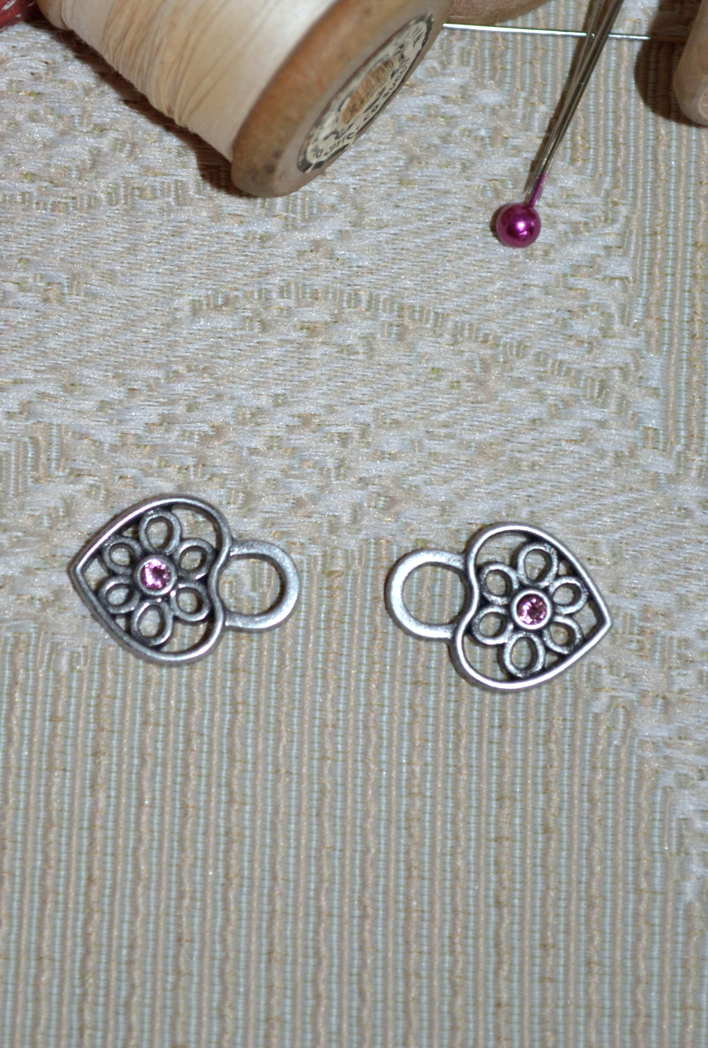 These dainty heart shaped hooks are perfect for either petite women’s or children’s dresses. Antique matte silver finish with delicate openwork flower and a sparkling pale pink crystal for extra interest. Heart measures about 1/2 inch.