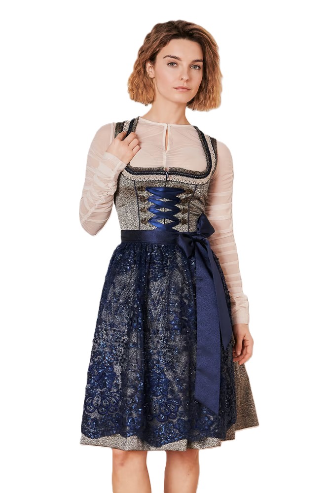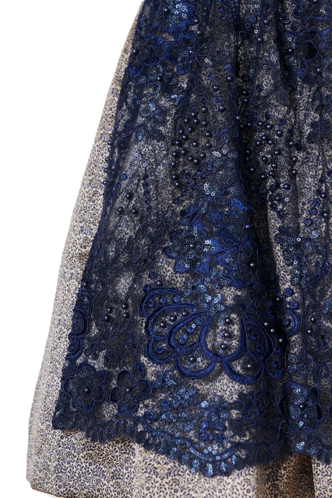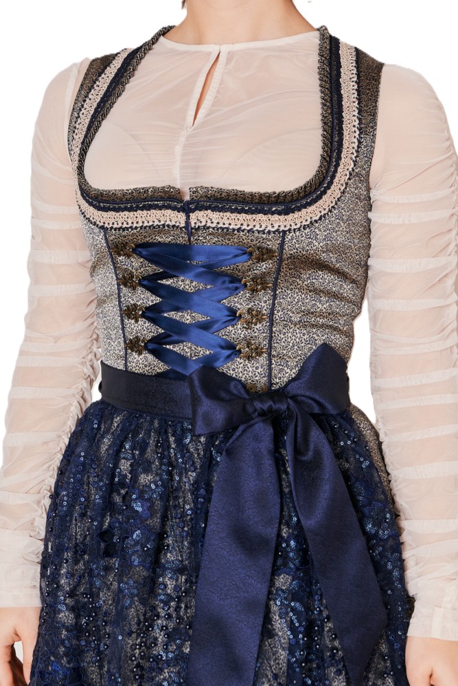 Tiny foliage motif pattern on this brocade dress is very subtle and elegant,ย as is the flat braid and lace trim around the neckline. The floral lace apron is the real star of the show.ย ย Tiny sequins were used in the making of the lace fabric that give off a lovely shimmer.ย The apron is also accented with navy pearls.ย Satin apron strings match the lacing ribbon and piping on the bodice.