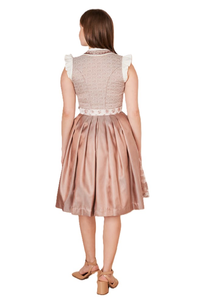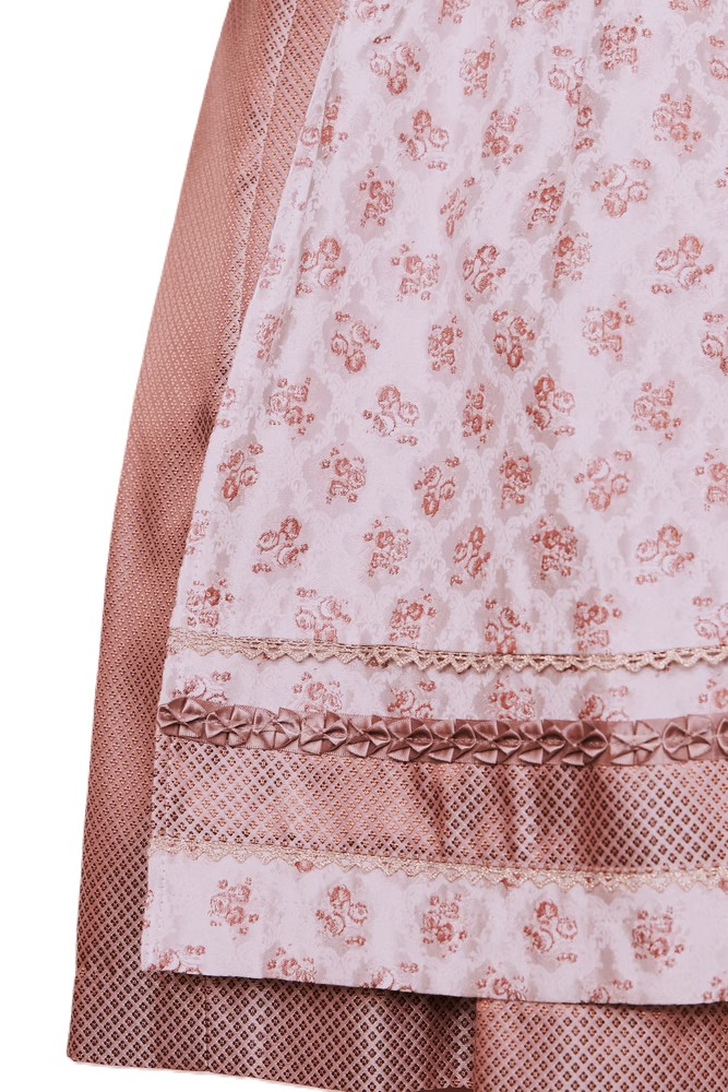 Feminine dress in shades of rose pink with ivory.ย The zip front brocade bodice is an allover tiny pattern of leaves and vines in a deep rose colour on an ivory ground and is beautifully trimmed with folded ribbon, pearls and lace trim.ย The lacing hooks are pewter finish.ย The skirt portion is a coordinating tiny geometric pattern brocade in deep and light rose pink.ย The apron is rose pink with a small floral bouquet motif in a deeper shade, and is trimmed along the hem with a band of the skirt fabric, metallic lace accented with the same folded ribbon used on the bodice.
