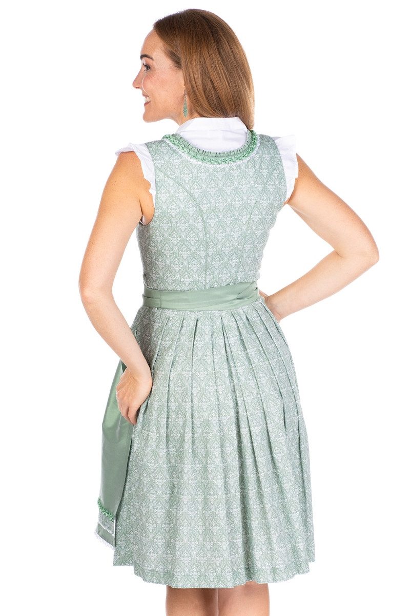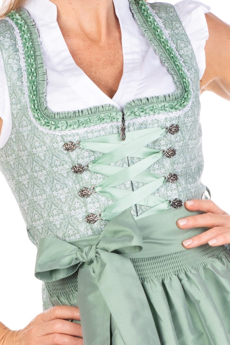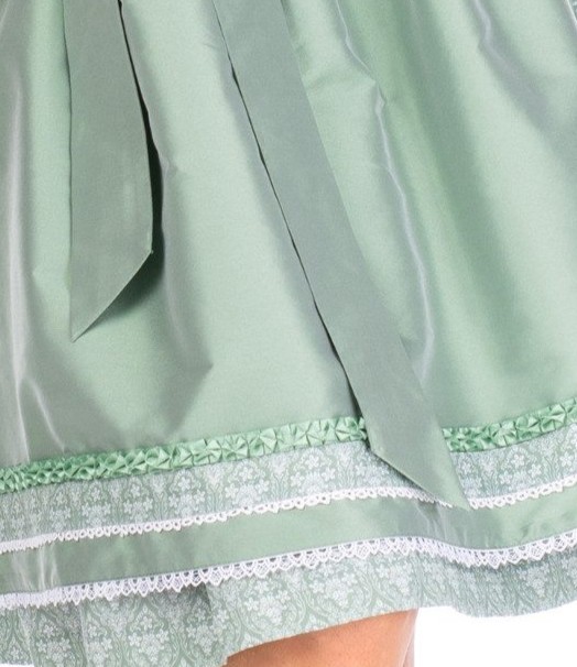 Feminine dress in a pretty shade of soft jade green with small-scale white allover floral damask print.ย Cotton dress features traditional lacing and hooks on the zip-front bodice, and pleated ribbon and lace trim around the neckline.ย Taffeta apron is trimmed at the hem with pleated ribbon, lace and fabric banding.