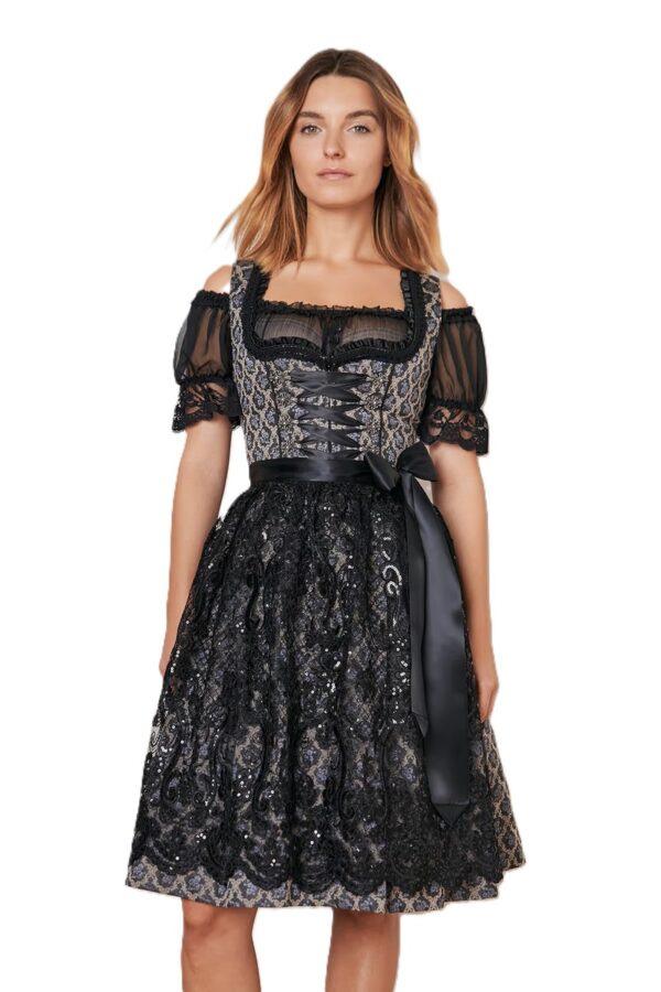 This brocade dress combines three great neutral shades in an allover print that incorporates taupe foliage diamonds with a central grey floral motif on a black ground for an elegant and understated look that still provided visual interest.ย ย The zip front bodice has a sweetheart neckline trimmed with a satin ruffle and flat braid; silver-tone hooks have a rhinestone accent.ย Black satin lacing ribbon matches the apron ties.ย ย The unlined black lace apron is decorated with scattered sequins for added bling.