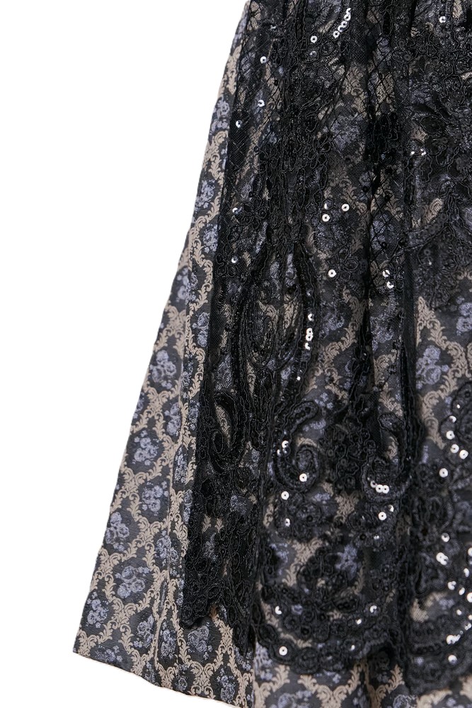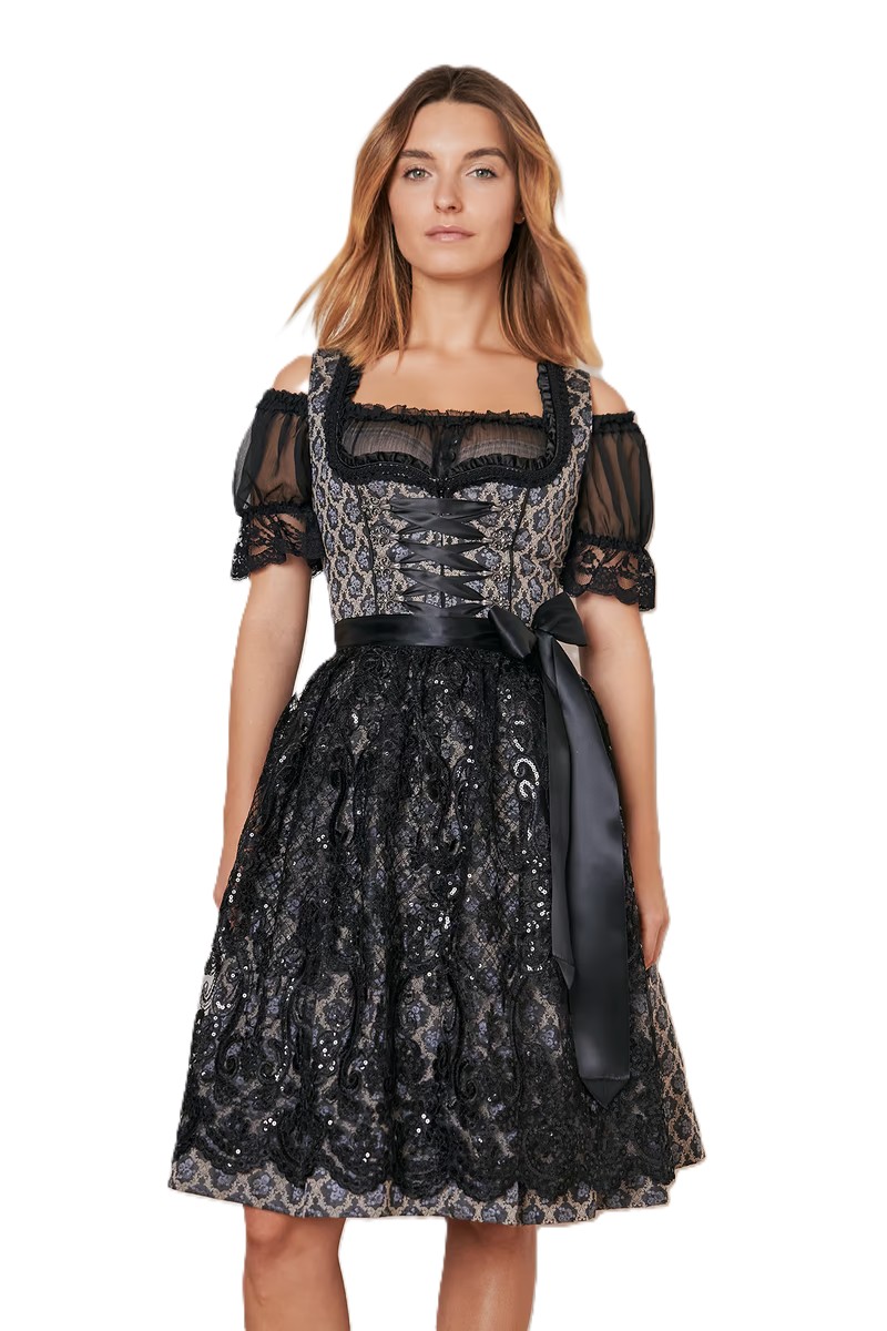 Classic print and neutral colour makes this dress a timeless addition to your oktoberfest wardrobe.ย Beautiful brocade fabric in black with taupe leaves intertwined in a diamond pattern with a soft silver grey floral motif in the centre of each diamond.ย Zip front bodice with antique silver hooks with rhinestone accent; neckline trimmed with flat braid and satin ribbon ruffle.ย The apron is pretty embroidered black lace with a floral and lattice pattern and scalloped hem, and features black sequin accents.