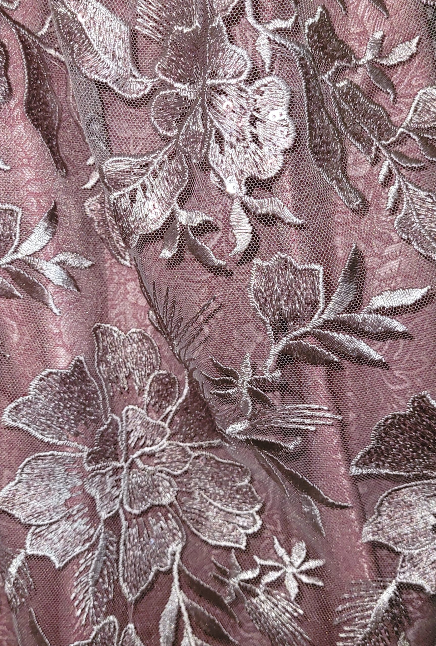 Lovely brocade dress in allover floral pattern in soft raspberry pink/old rose colour combination.ย  Front zip with open hooks for lacing ribbon.ย  Hooks have two sparkling rhinestones.ย  Apron is embroidered lace and is accented with clear sequins for shimmer.ย  Wide satin ties match the lacing ribbon which is included, along with two replacement hooks.