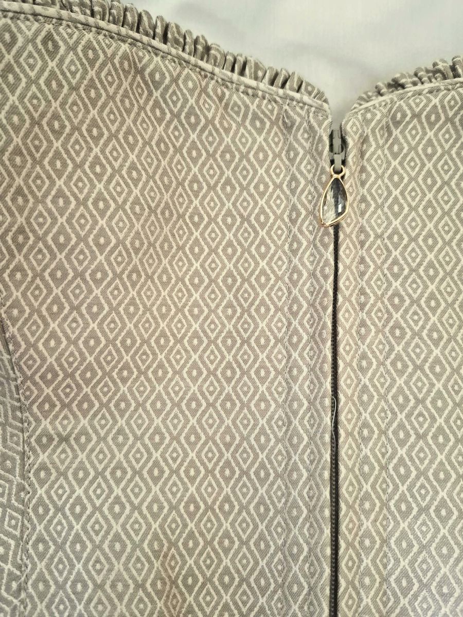 Trending monochromatic dress in a neutral sand beige brocade with allover tonal diamond pattern.ย  Zip front bodice has fabric ruffle around the neckline and a crystal zipper pull.ย  The apron is a burnout voile in a pretty allover random leaf pattern.