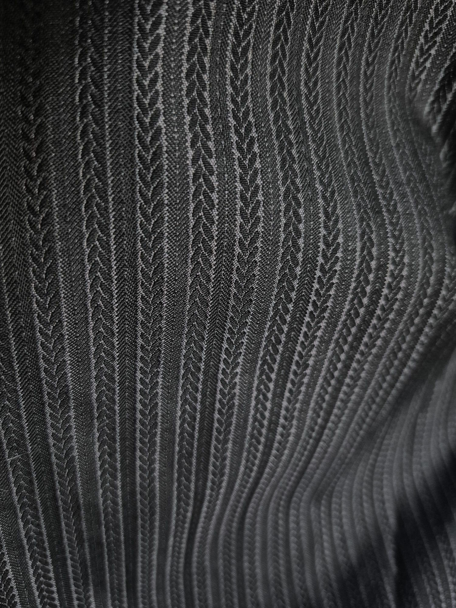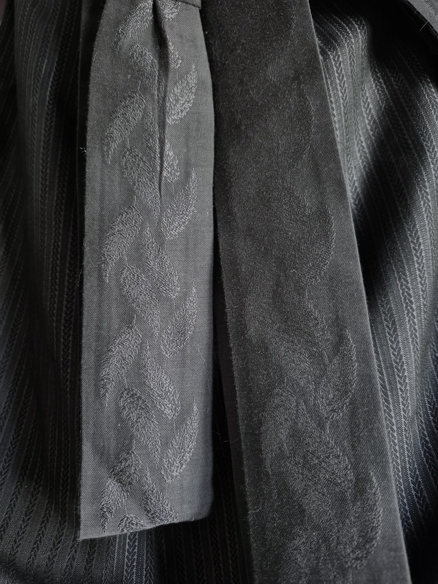 Elegant and understated dress features black velvet zip front bodice with filigree clip; skirt portion is black brocade with delicate allover fan motif in silver grey.ย The apron is deep charcoal with woven chevron stripes in silver grey alternating with grey chambray stripes; apron ties are charcoal with a tonal leaf/feather pattern with a slight sheen.