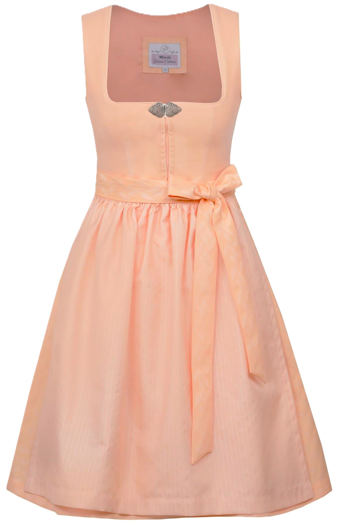 Trending monochromatic dress in a bright, fresh shade of Peach features velvet zip front bodice with decorative antique silver clip at neckline.ย Both the skirt and apron are coordinating brocade, the skirt in an allover frond pattern and the apron in a textured vertical stripe.
