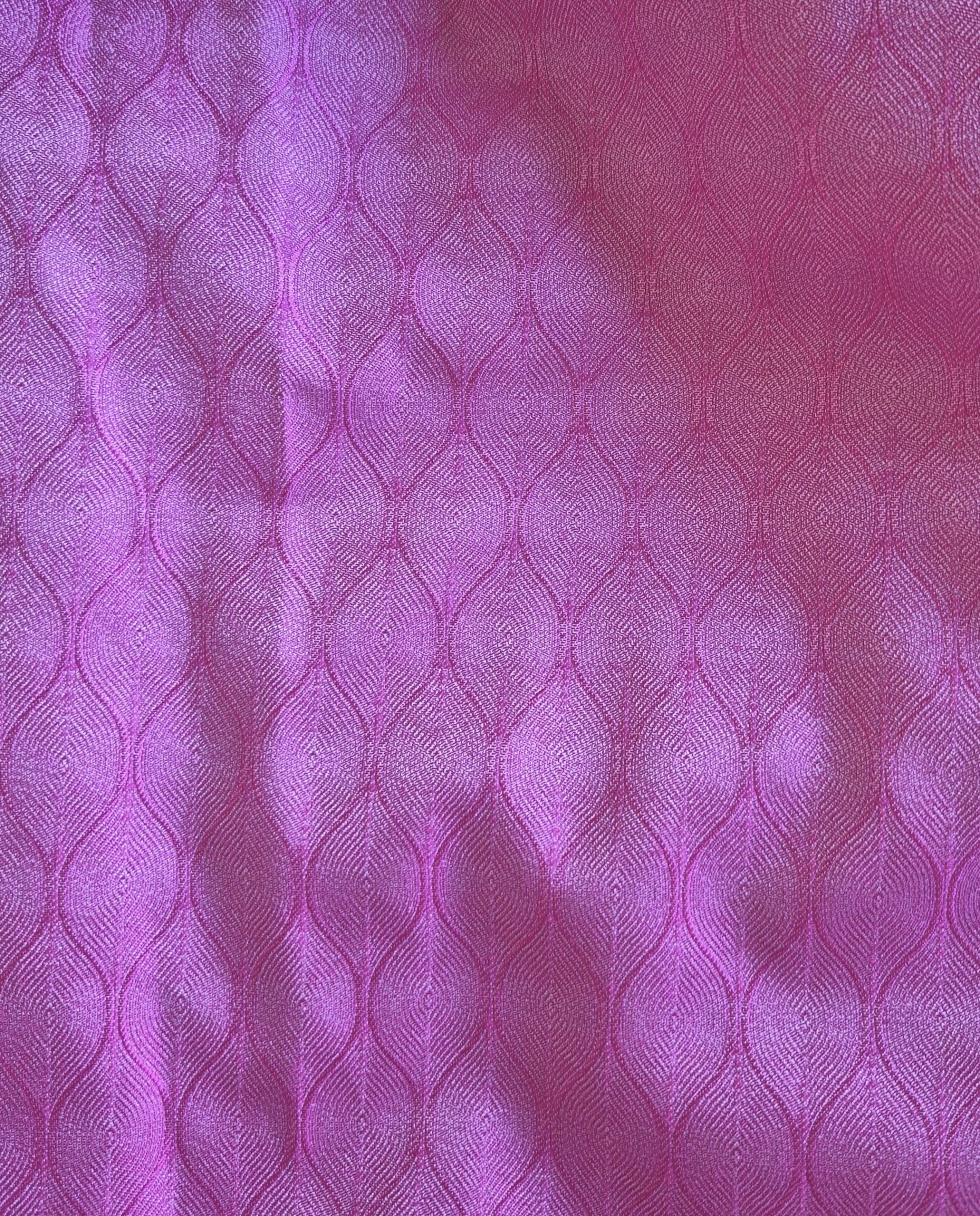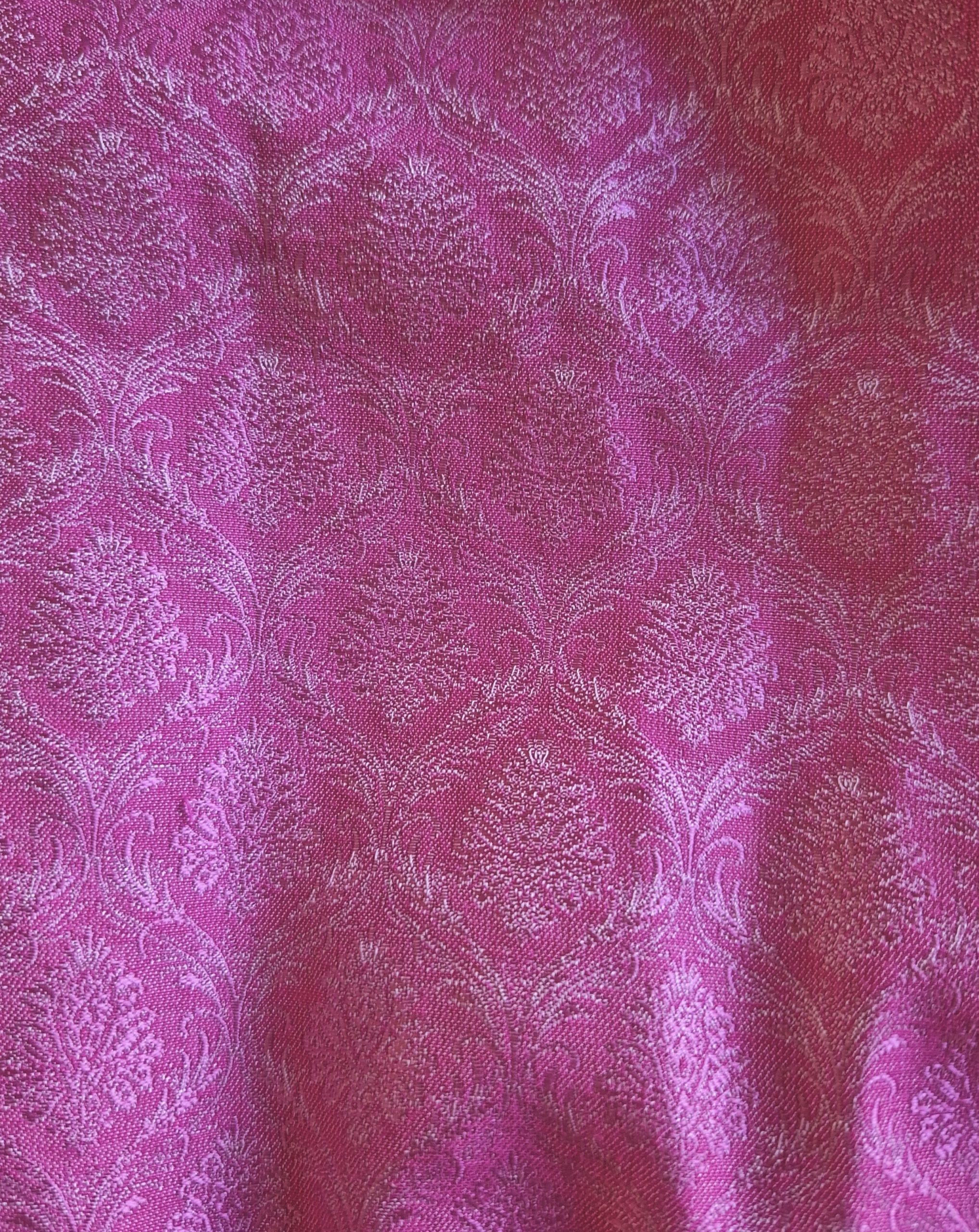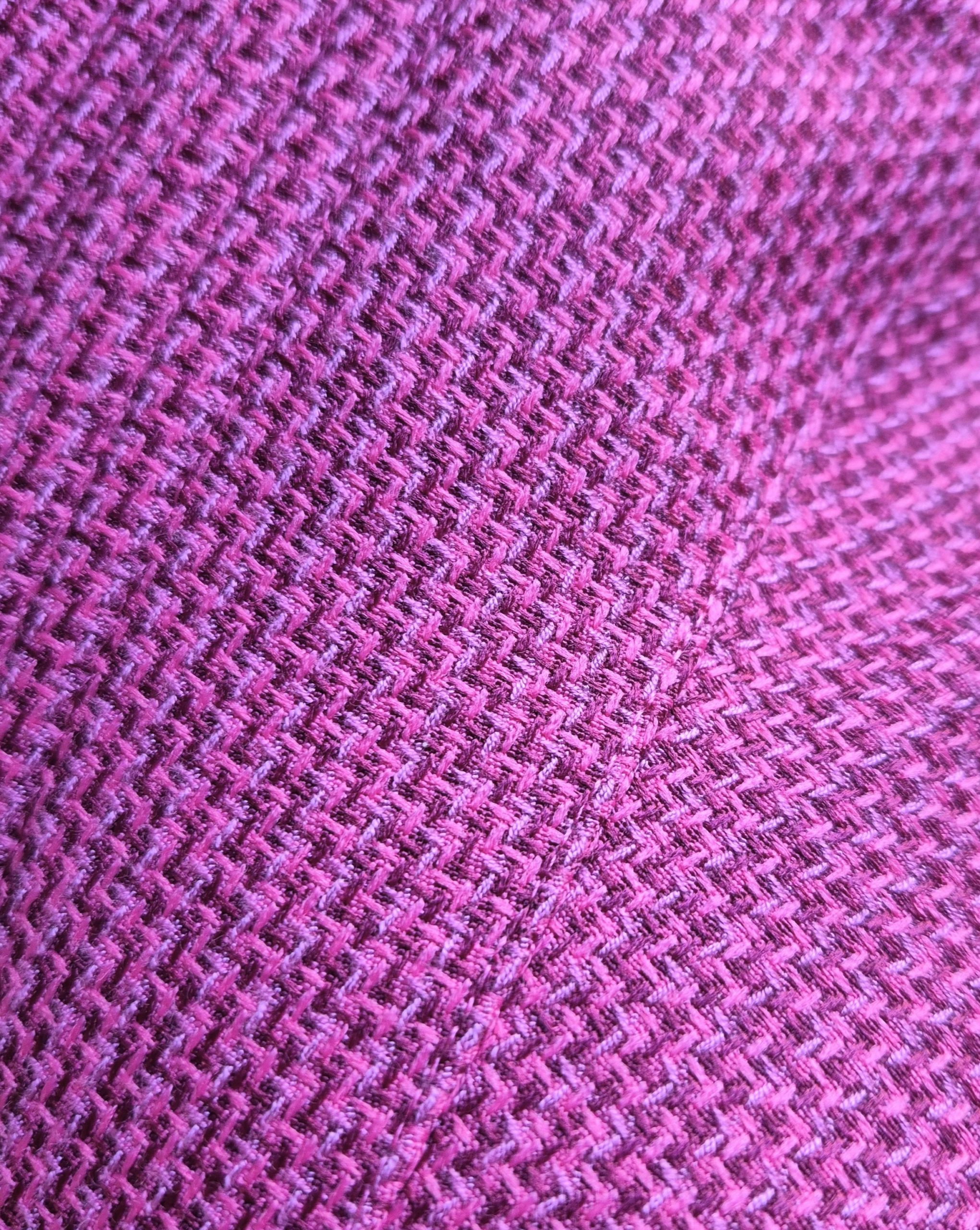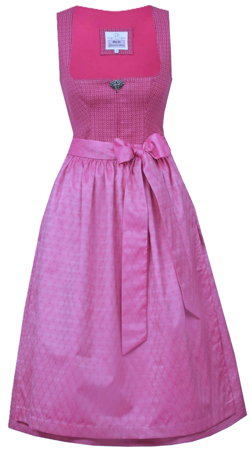 Three different patterns and textures combine to make this dress a real stunner!ย The bodice is woven in a chevron pattern using several shades of pink and burgundy giving off a bit of a vintage vibe, while the skirt portion is a traditional brocade with alloverย floral motif.ย The apron is also a shot taffeta brocade with a contemporary overall teardrop woven design, with concentric lighter threads adding even more visual interest.ย Zip front features antique silver clasp at the top of the zipper.