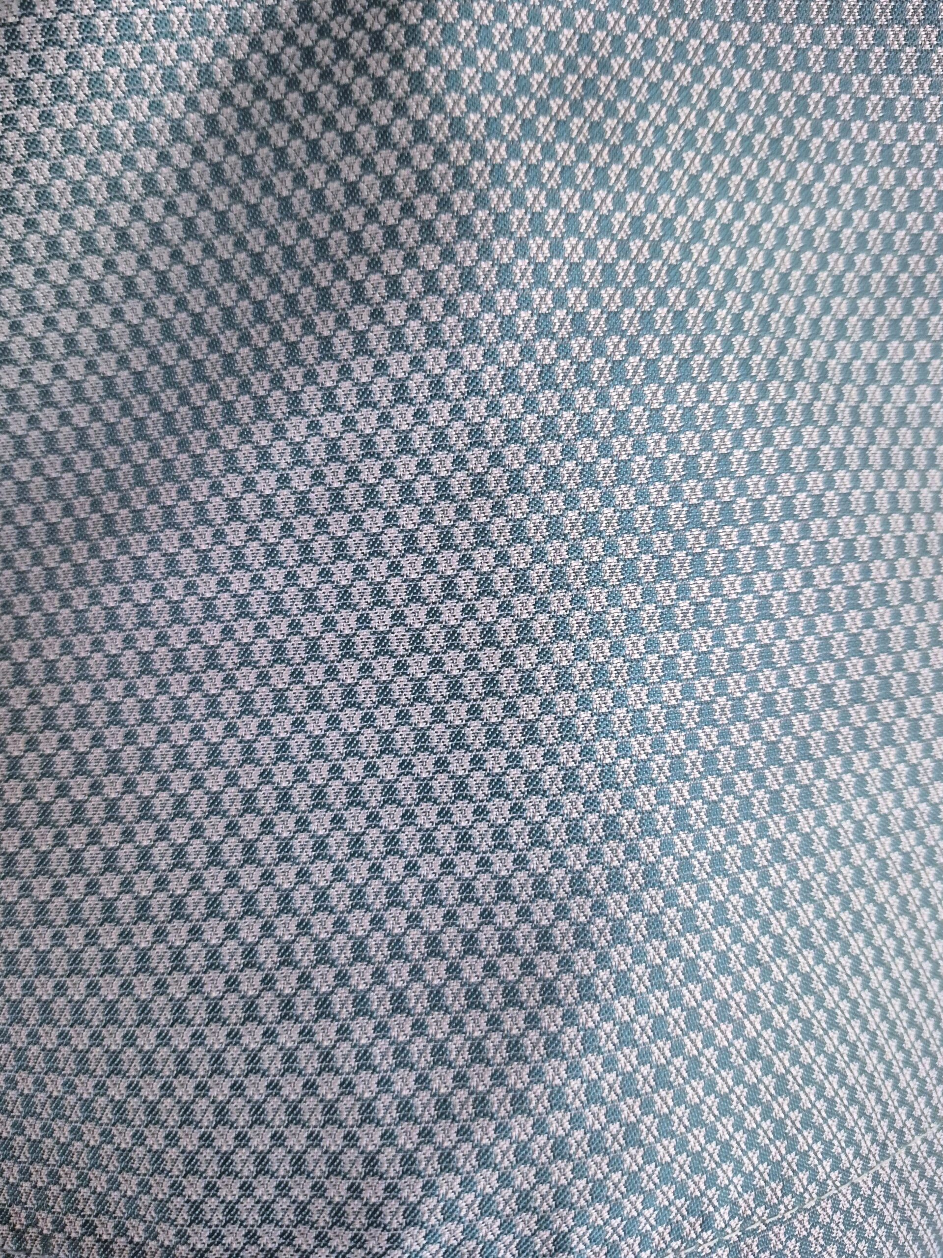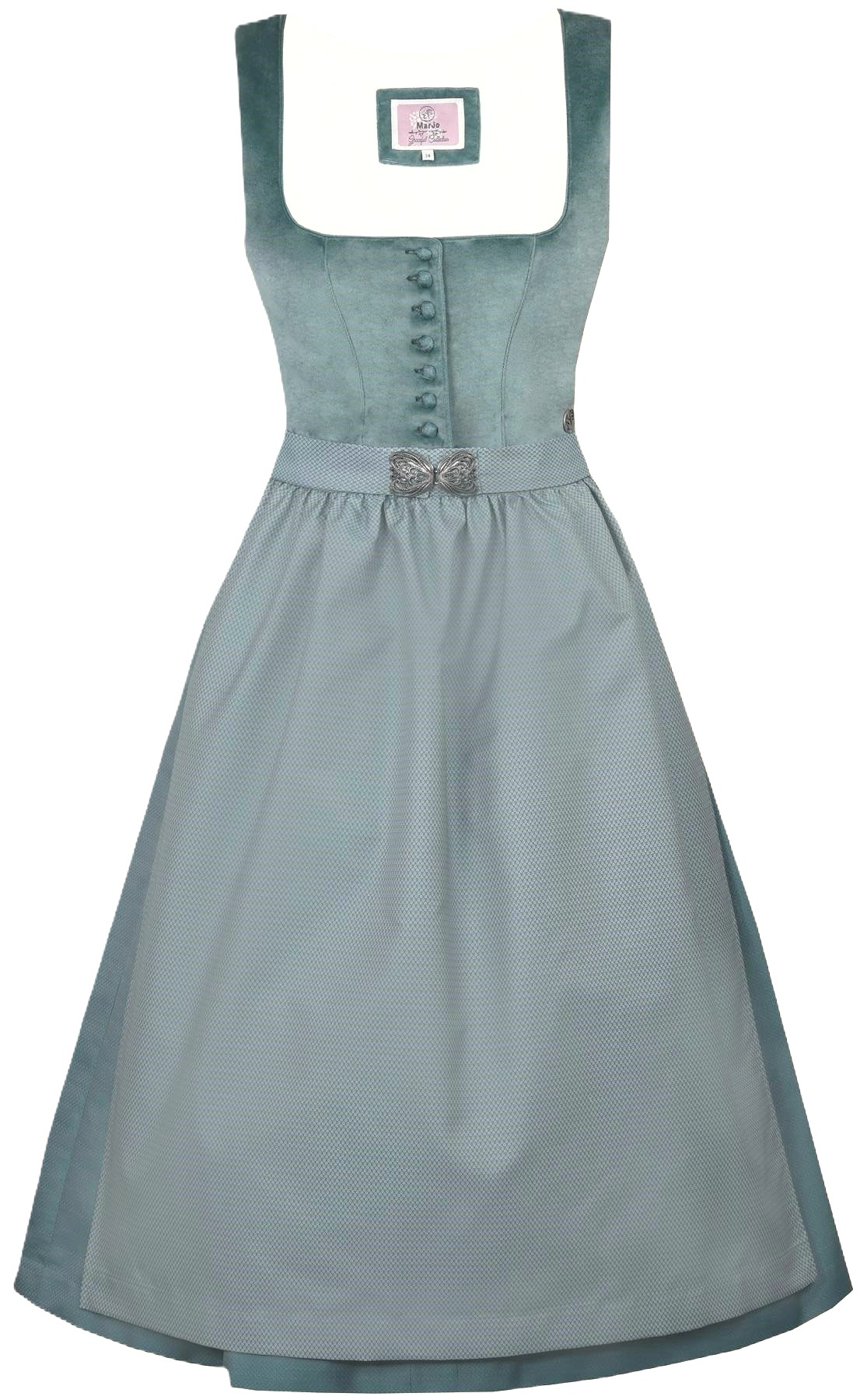 This pretty soft aqua/sea green dress features a lined velvet bodice with covered button closure with matching poly brocade skirt.ย The side seams of the skirt conceal two pockets, each with an invisible zipper closure to safely store your phone and other small items.ย The lightweight brocade apron is a tiny allover geometric pattern brocade in sea green with soft beige; the partially elasticized band fastens together at the front with antique silver tone filigree clips. See close-ups of fabrics in secondary photos.