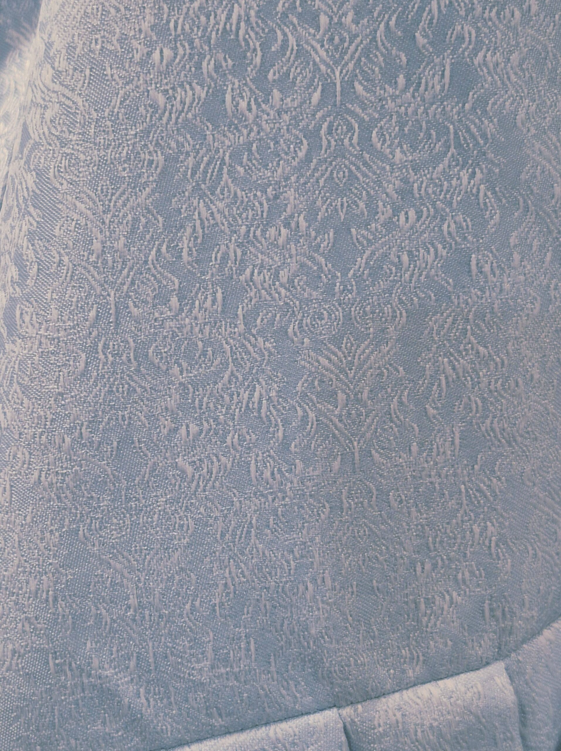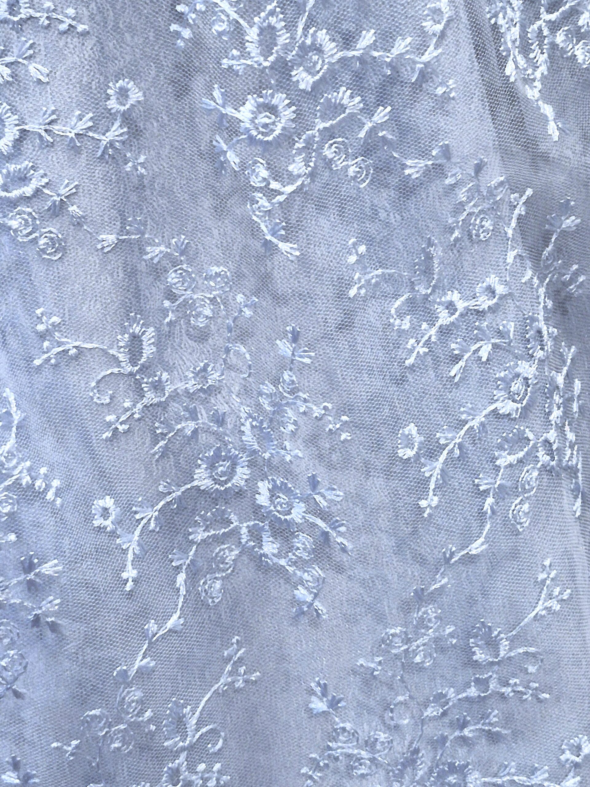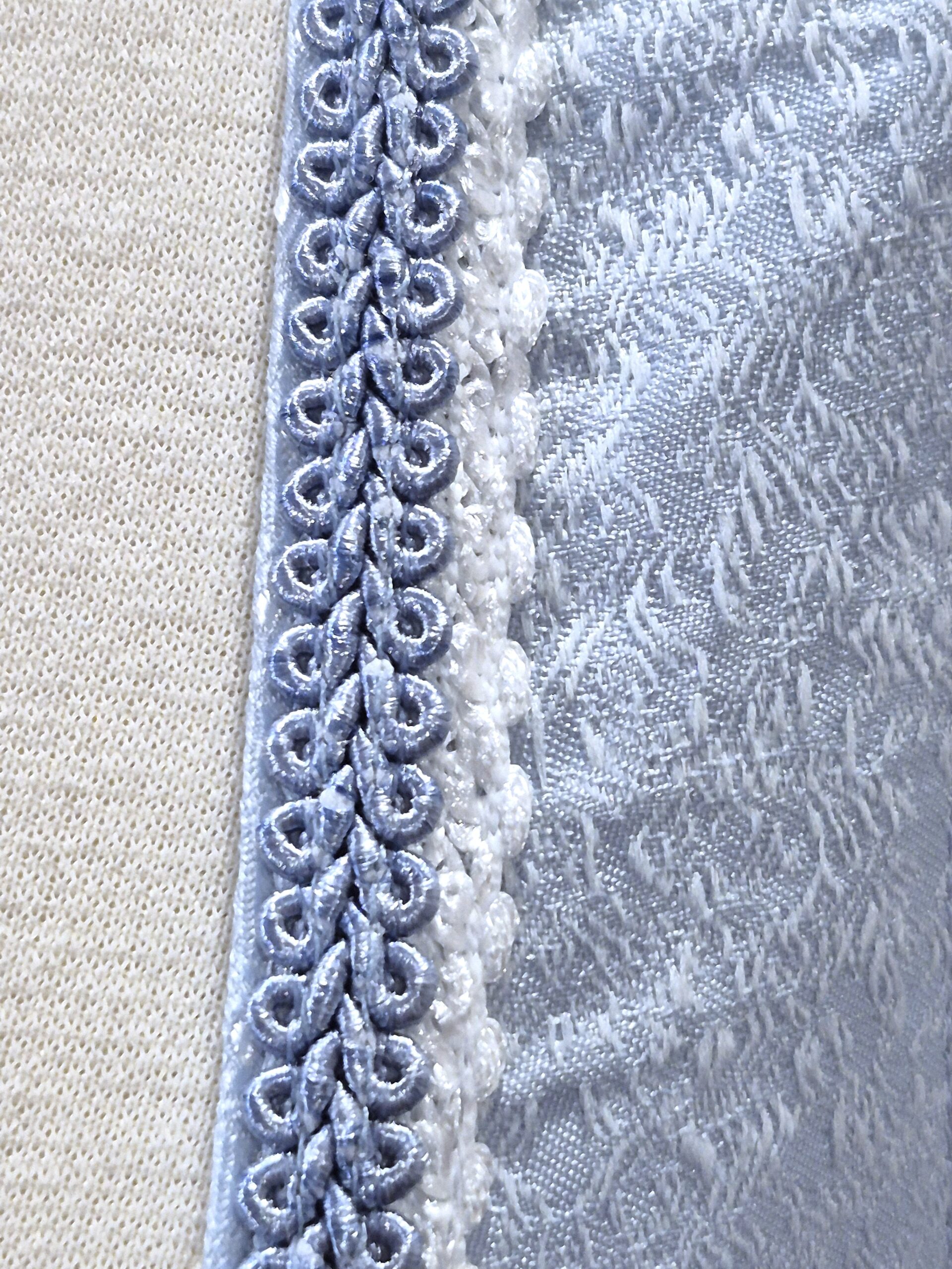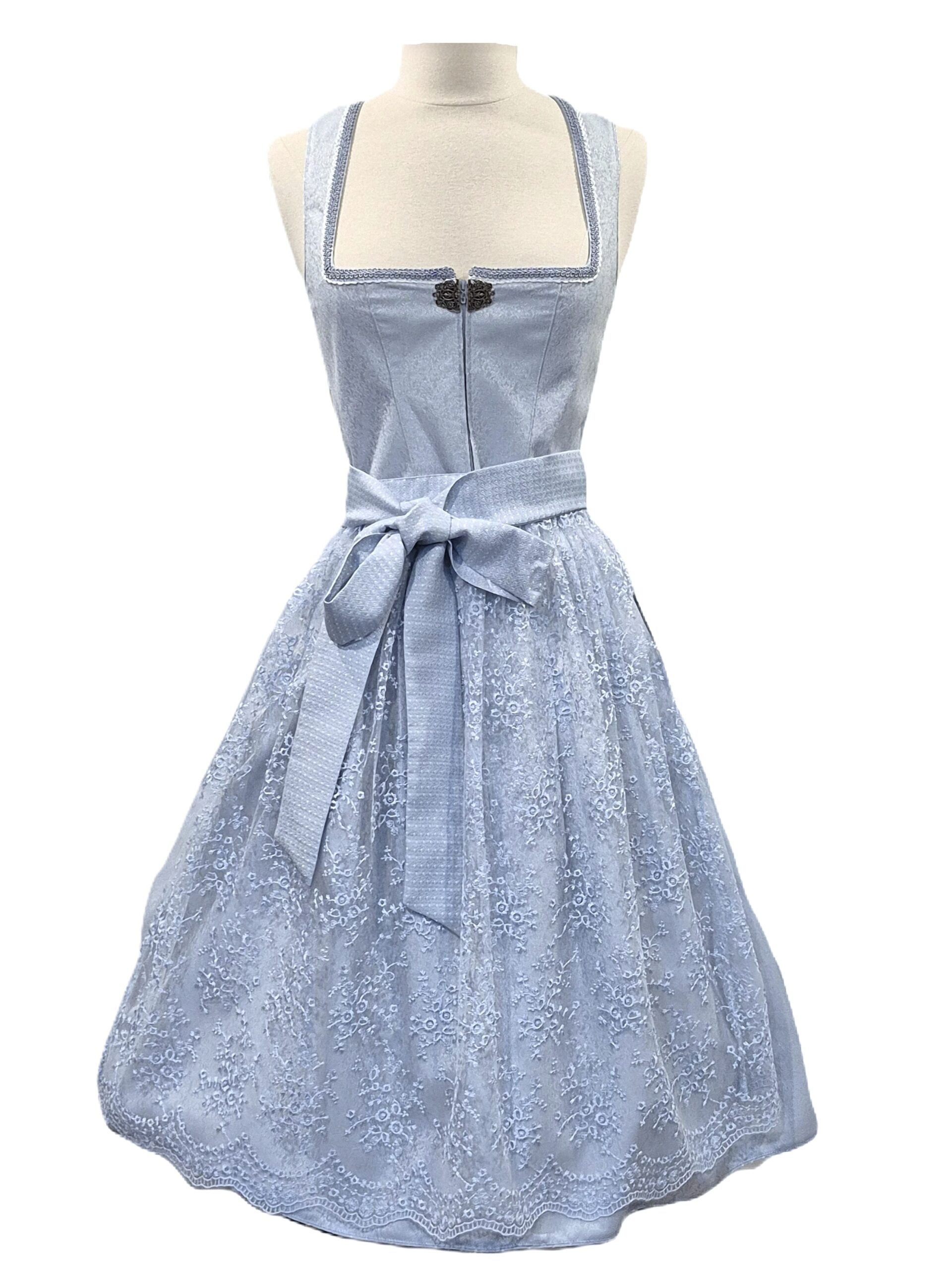 Lovely pale blue brocade dress in a pretty shade of pale baby blue has a front zip bodice with a decorative filigree antique silver finish clip at the top of the zipper.ย Neckline is trimmed with flat braid and lace.
