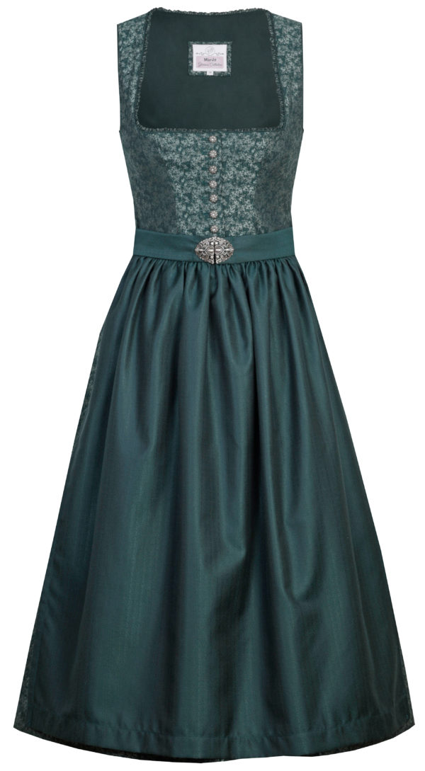 Elegant mid-calf length dress in a stunning shade of deep jade green brocade, with an allover silver-grey floral pattern.ย Buttons up the front of the bodice are antique silver finish in a cast stylized floral shape with a small center rhinestone.ย Neckline features a narrow fabric ruffle with solid green piping.ย Solid green matte finish apron has a chevron weave for added interest; the partially-elasticized apron ties fasten together at the front with a pretty filigree clip.