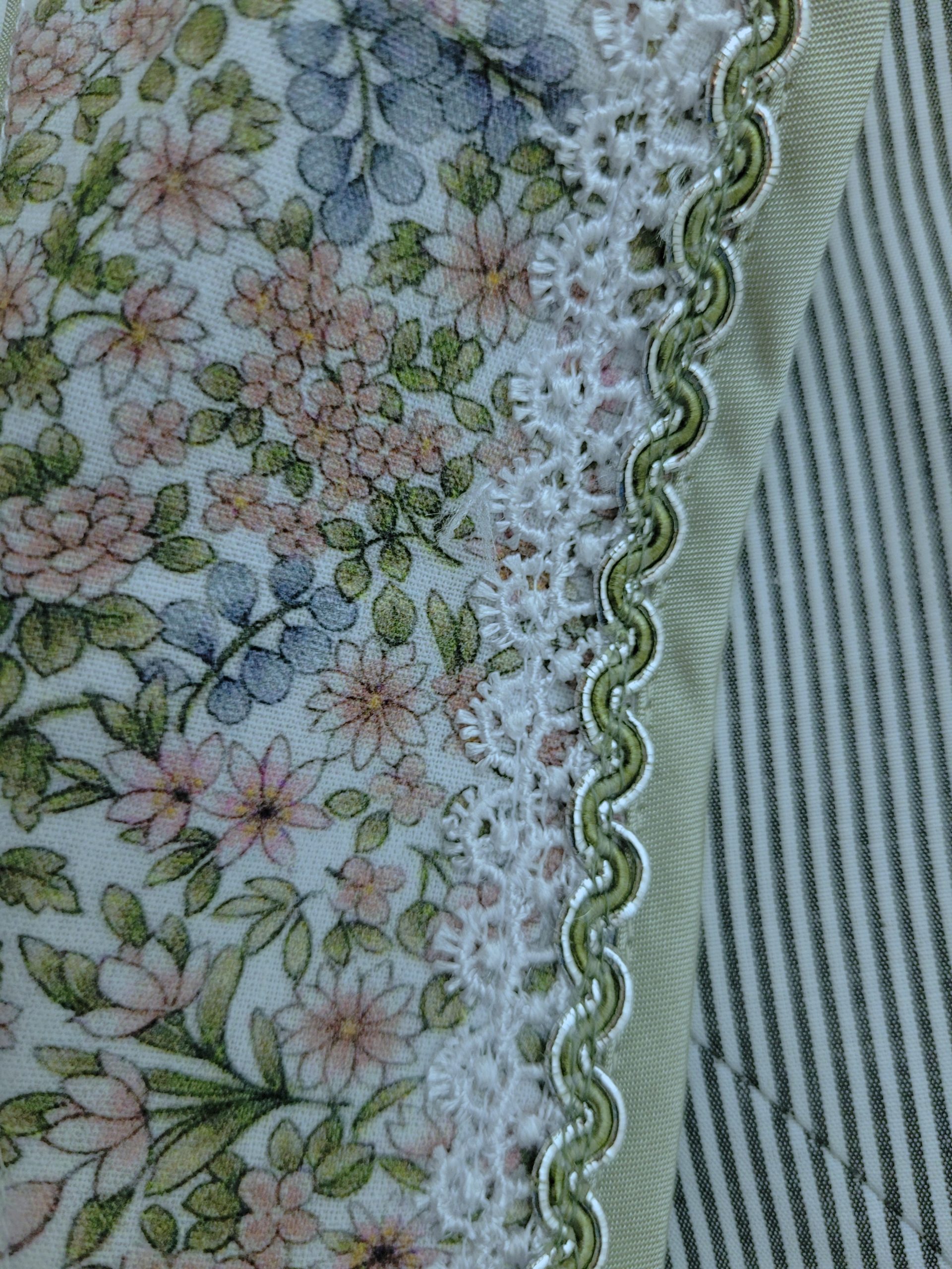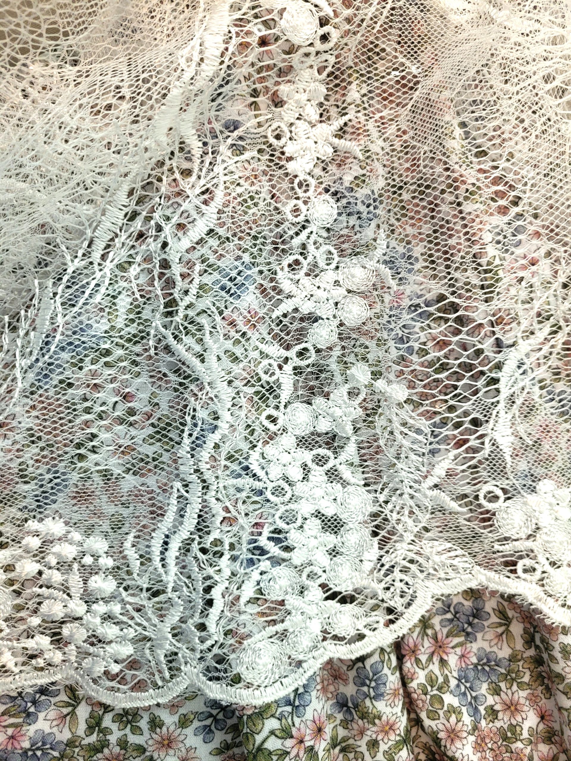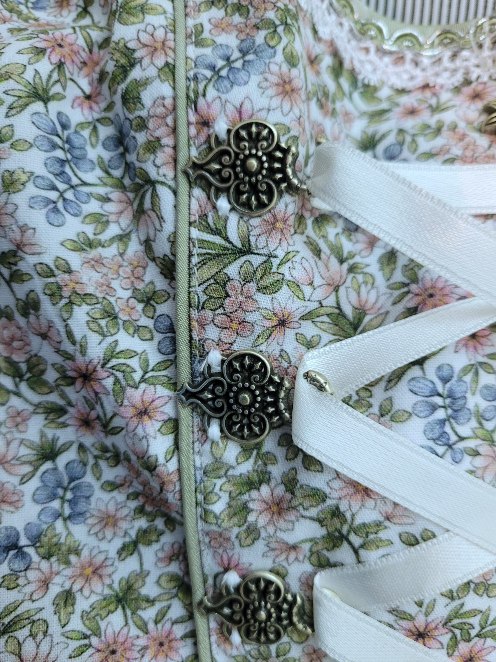 Sweet cotton dress in an allover rose and blue floral print with sage green leaves on soft white background.ย  Front zip with ribbon lacing through antique silver hooks.ย  Bodice neckline is trimmed with fabric banding and flat braid with a metallic silver thread.ย  Soft white lace apron is sprinkled with clear sequins for just a hint of sparkle.
