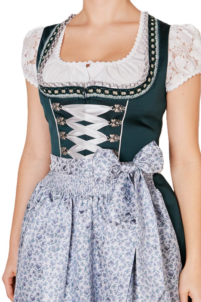Lovely brocade dress in a gorgeous shade ofย deep jade green features traditional pleated ribbon and flat braid trim around the neckline and pretty silver-tone bodice hooks with a heart motif and rhinestone accents.ย ย Apron is soft white with allover floral pattern in shades of green and blue.