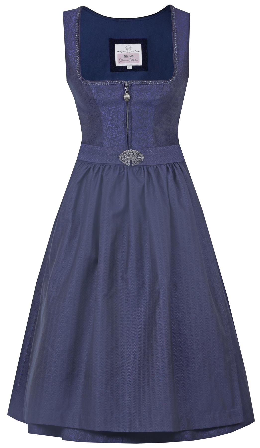 Another classic monochromatic colour scheme from Marjo; this time in rich navy blue.ย ย The zip-front dress is in a poly brocade with tonal allover small floral pattern.ย The lightweight brocade apron, in shade of deep navy, has a subtle vertical stripe geometric pattern. Bodice is trimmed around the neckline with navy flat braid with a fine silver metallic thread running through it. The elasticized apron ties fasten together at the front with a pretty filigree metal clip.