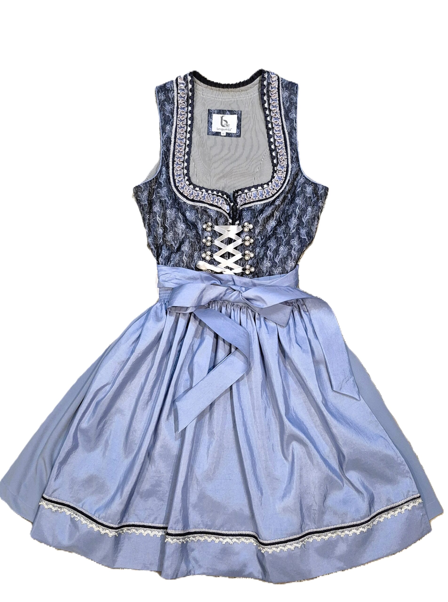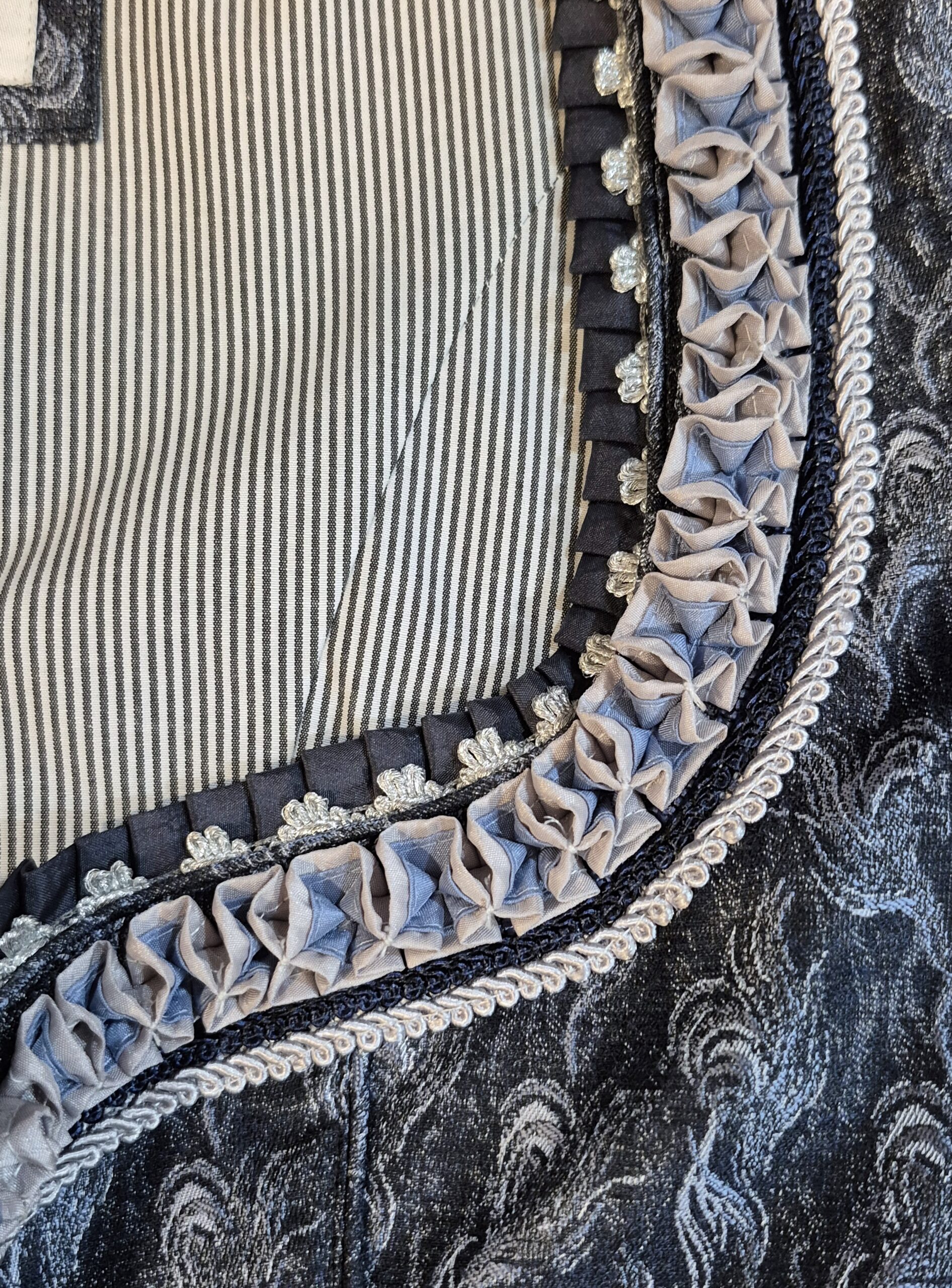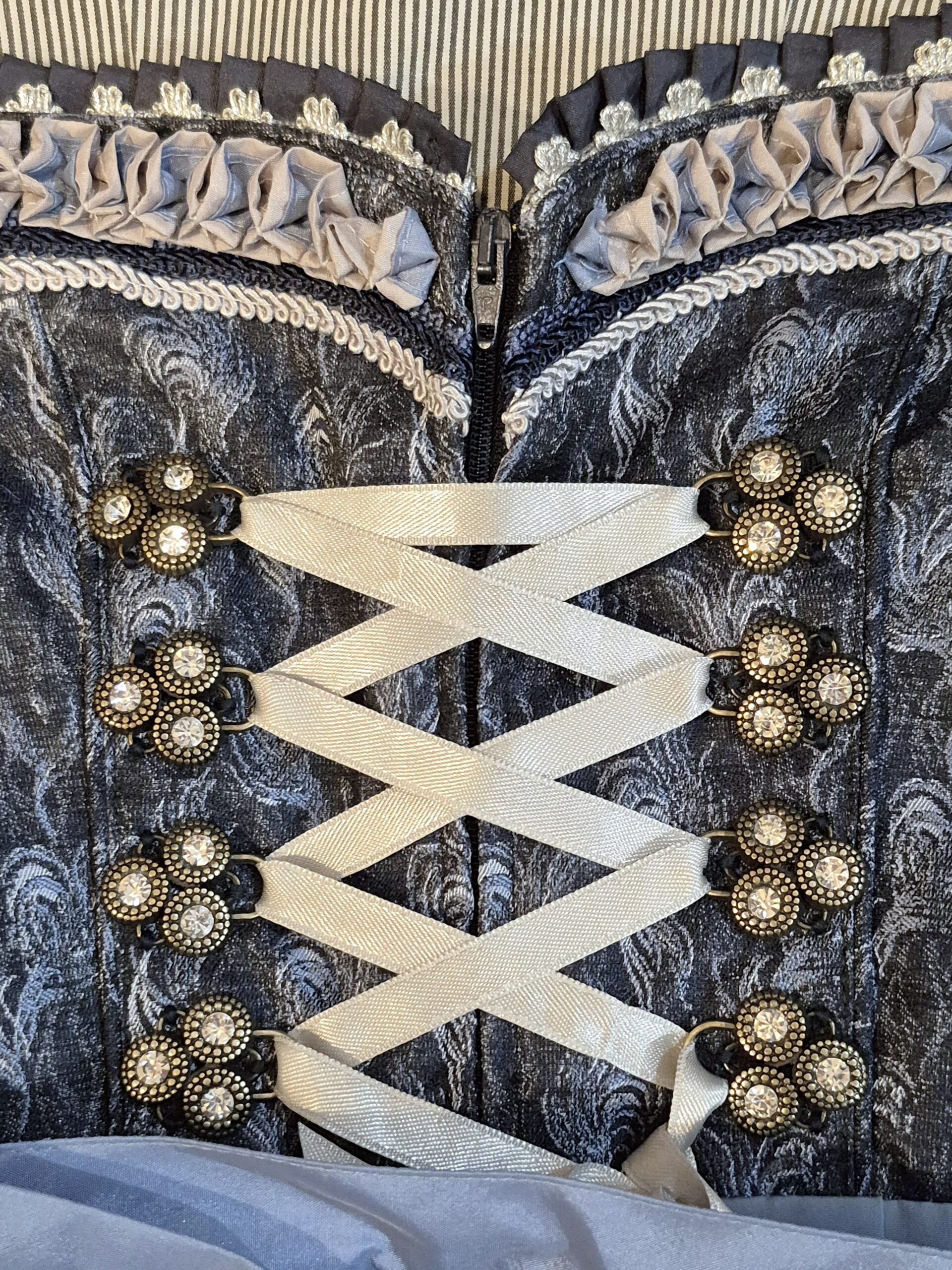 Lovely dress features brocade bodice will allover swirl pattern in shades of blue in varying intensities. The zip-front bodice is trimmed around the neckline with several rows of pleated ribbon, fabric and lace.ย The silver-tone lacing hooks have rhinestone accents and hold a blue satin ribbon.