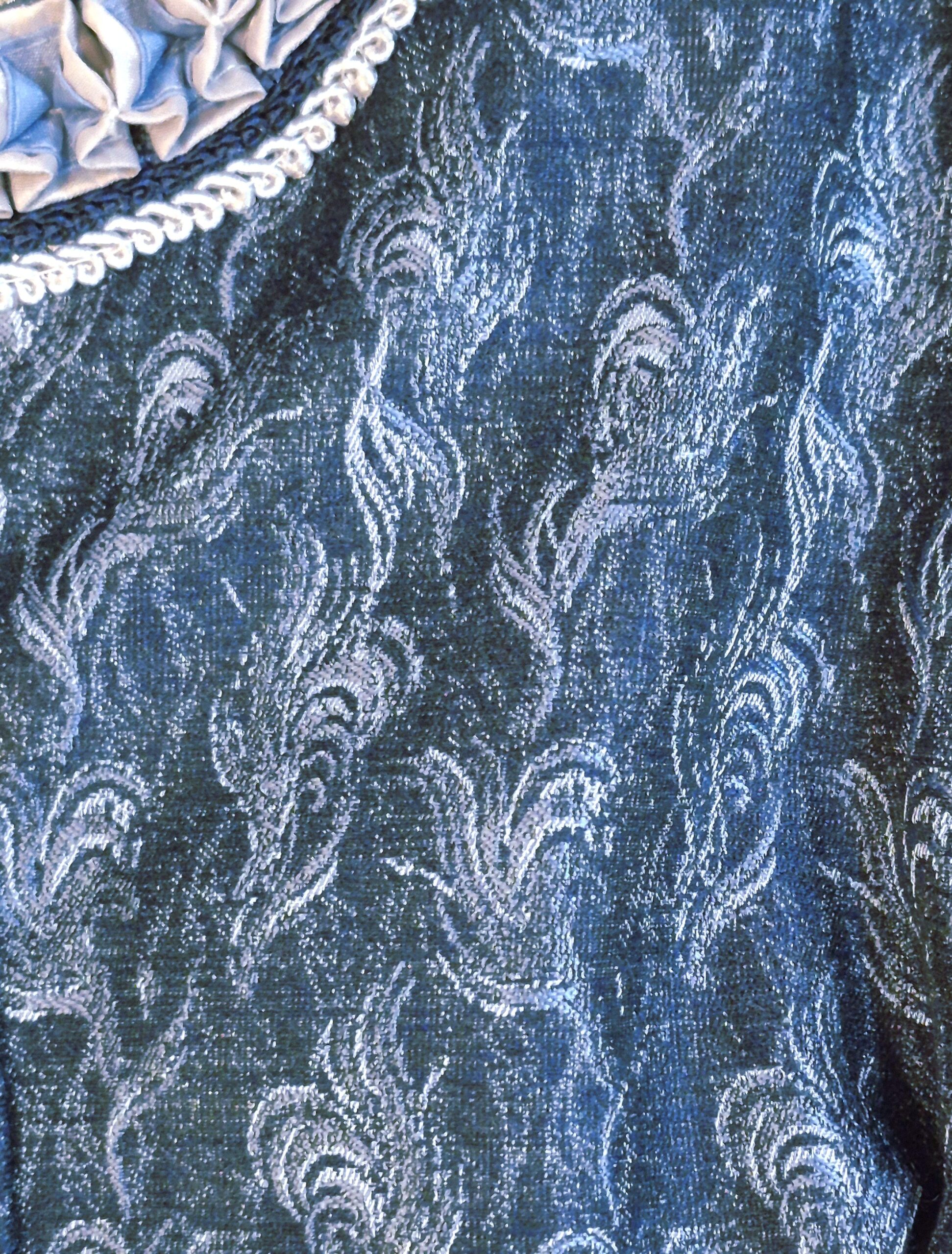The two lighter shades of blue in the bodice are picked up in the lightweight crepe skirt and the taffeta apron.