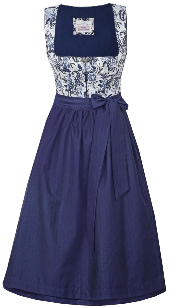 Beautiful dress with lots of interest due to the use of various shades of blue in the brocade bodice, which are then picked up by the skirt and apron โ both of which also have great texture.ย The contemporary foliage print on the bodice incorporates both deep and brighter shades of blue against an off-white ground; some of the elements have a little more sheen than others which gives real dimension to the fabric.