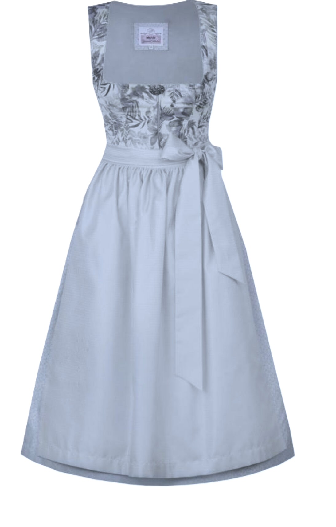 Beautiful dress with lots of interest due to the use of various shades of grey in the brocade bodice, which are then picked up by the skirt and apron – both of which also have great texture.ย The contemporary foliage print on the bodice incorporates both warm and cool shades of grey against an off-white ground; some of the elements have a little more sheen than others which gives real dimension to the fabric.